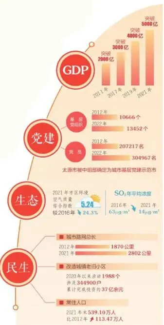 经济总量实现由2000亿元到5000亿元的重大跨越,战略性新兴产业、高技术制造业对工业增长的贡献率均达到30%左右,服务业占比提高至57.9%;城市基础设施投资年均增长26.5%;城镇居民人均可支配收入年均增长7.5%……十载砥砺前行,十载奋楫争先,太原市交出一份亮眼成绩单,产业转型、城市面貌、民生幸福打开新图景。
