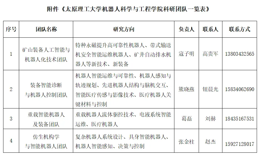 5.研究方向需与学院的科研团队研究方向一致或相近,具体参考附件1《太原理工大学机器人科学与工程学院科研团队一览表》。
