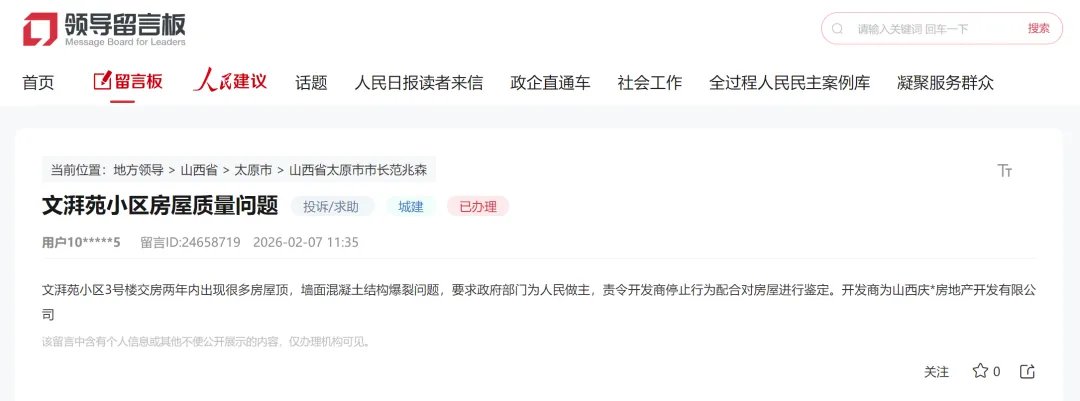 记者从人民网领导留言板获悉,网友反映太原市文湃苑小区3号楼交房两年内出现很多房屋顶,墙面混凝土结构爆裂问题。