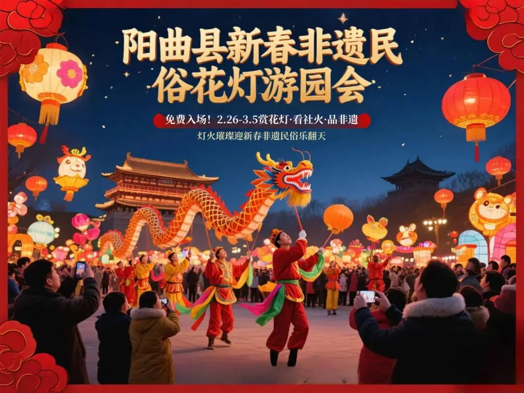 阳曲县将于2月26日至3月5日(农历正月初十至正月十七)在阳兴公园及新阳大街举办“首邑国潮民俗年·阳曲欢腾闹元宵”新春非遗民俗花灯沉浸式游园会。