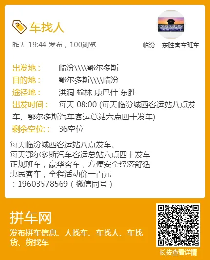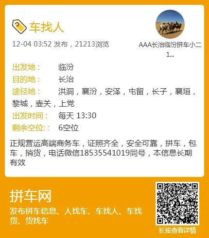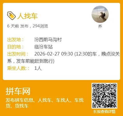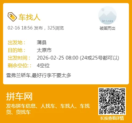 临汾365拼车 ▍车找人:蒲县→太原,2月25日出发;人找车:汾西→临汾,2月27日出发