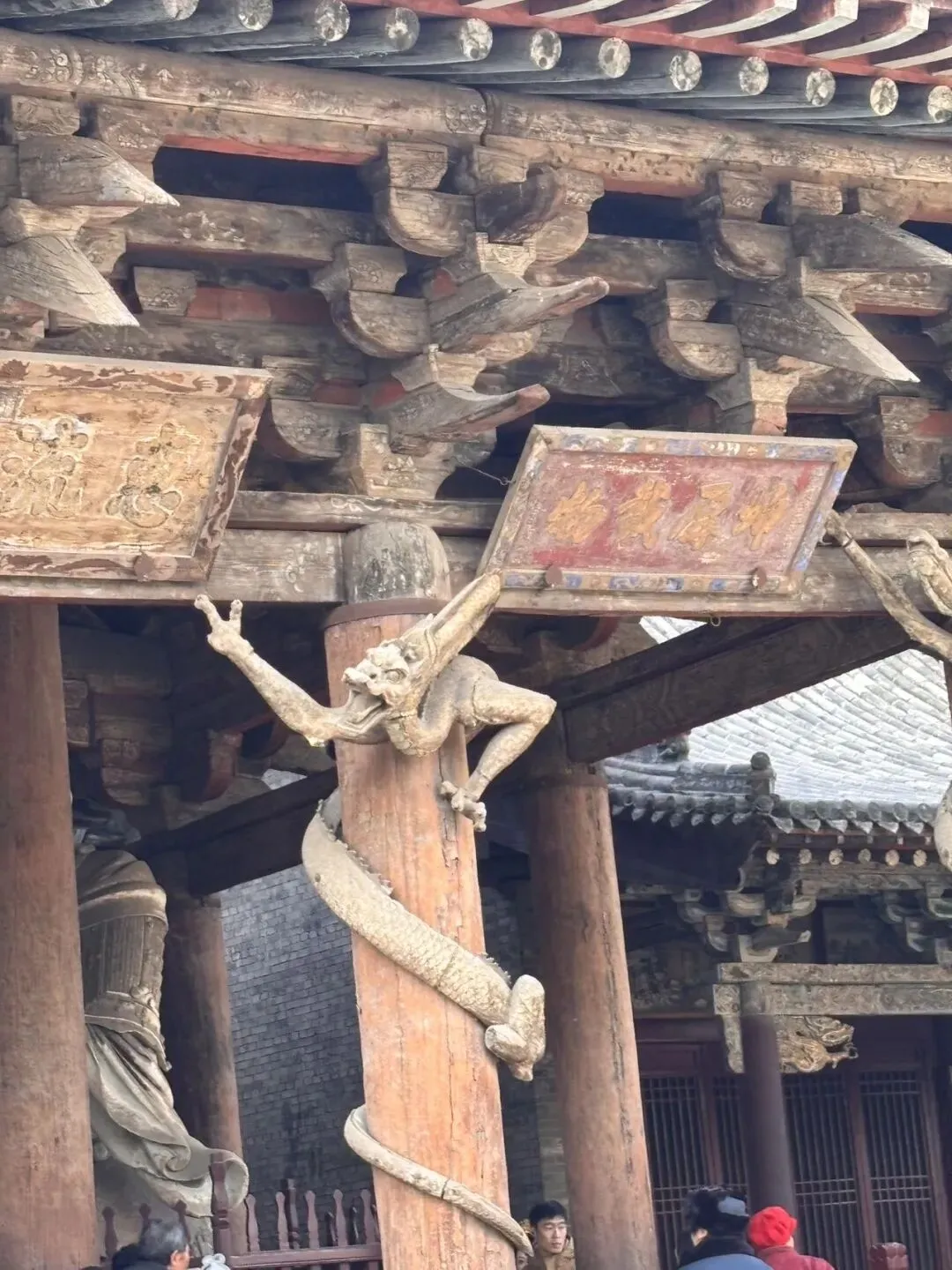 印象深刻的是圣母殿前的八根大柱上各盘着一条木雕神龙。八条龙神态各异,形象逼真,历经千年风雨洗礼,仍活灵活现。尤其是右边第二条,伸出的龙爪断了两根,只剩两根就像人在比耶一样,人称比耶龙。