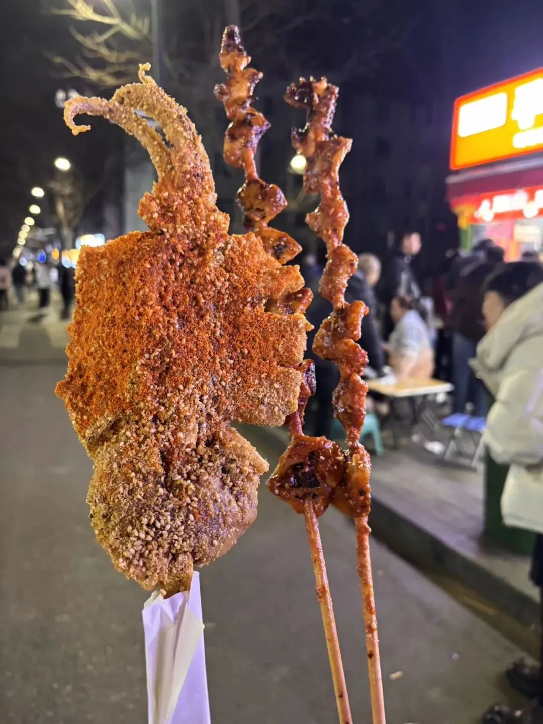 九点多钟,小吃街上店铺林立,各种风味小吃也算是应有尽有,游人不算是很多。品尝了特色小吃~沾串,自选串串,然后蘸着不同口味的秘制酱汁吃,便宜又好玩。个人感觉不太卫生,因为食客都是就着酱汁吃,难免会有孩子把酱料滴到酱碗里。