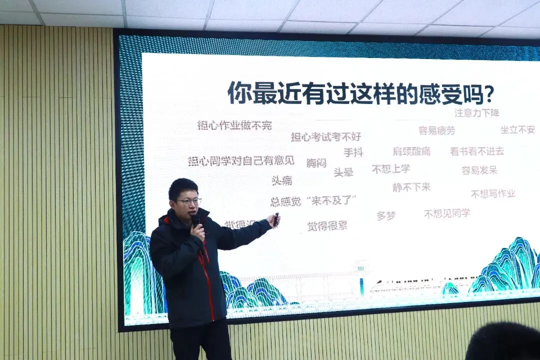青年讲师团成员赖祖冲没有站在讲台上宣讲“坚强”与“克服”,而是递给同学们一个情绪解压工具箱:呼吸法、运动解围、小目标分解……他还告诉大家,国家从“十四五”到“十五五”规划中,有一整套持续加强心理健康服务的保障政策。