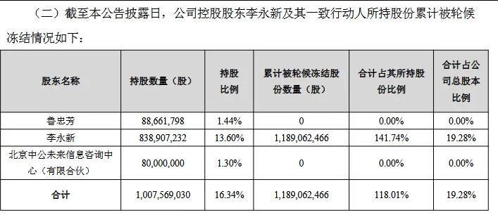 中公教育公告指出,控股股东李永新及其一致行动人累计被质押股623,083,598股,占其所持股份的61.84%,占公司总股本的10.10%;累计被司法冻结及标记股份863,909,030股,占其所持股份的85.74%,占公司总股本的14.01%;累计被轮候冻结股份(含本次)1,189,062,466股,占其所持股份的118.01%,占公司总股本的19.28%。