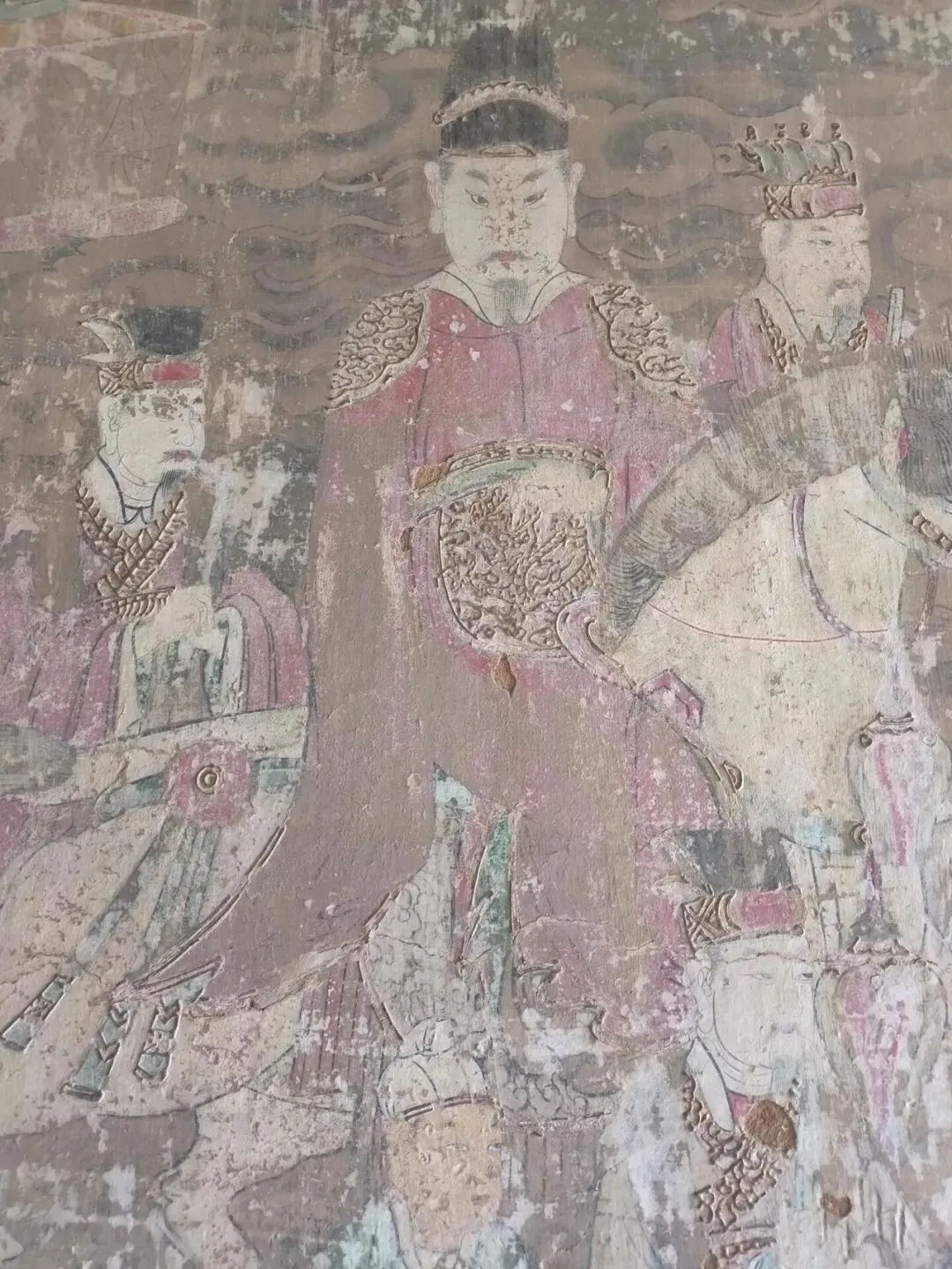 殿里的惊喜远不止建筑本身,东、西、北三面山墙上,还留着八十八平方米的明代壁画,用的是沥粉堆金的老技法,画面一展开,就是几百年前乡民祈雨、祭祀的真实场景。北墙正中间是“大王行雨图”,主角赵武头戴冕旒、身着衮服,在云雾里持着法器布雨,底下百姓一排排伏地叩拜,队伍里能清楚看到明代的服饰样式,还有当时的农耕器具,每一笔都透着生活的烟火气。东西两墙画的是迎神赛会的热闹场面,旌旗飘着,鼓乐响着,人物的动作神态活灵活现,有的举旗,有的敲锣,有的奔走,没有一点僵硬感,这在太原地区可是独一份的明代民俗信仰壁画,珍贵得很。后来清代又补绘了侍女生活的画面,整理妆奁、叠被铺床,这些细碎的日常场景,插在肃穆的宗教壁画里,非但不突兀,反倒让冰冷的殿宇多了几分人情味,像是把神仙的世界和凡人的日子连在了一起。