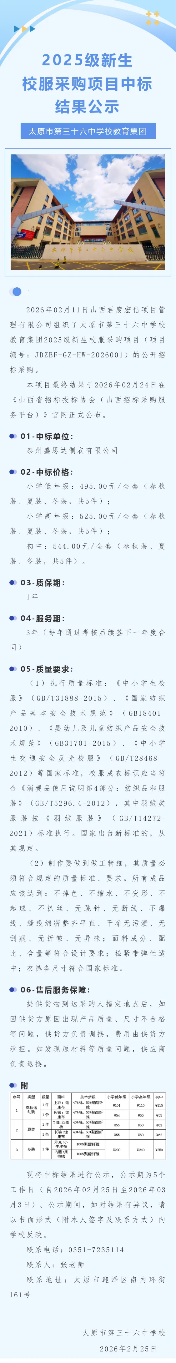>太原市第三十六中学校教育集团2025级新生校服采购项目中标结果公示