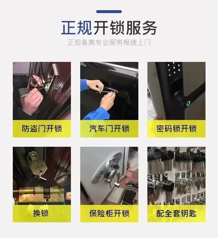 ✅ 防盗门开锁(木门 / 铁门 / 不锈钢门)✅ 指纹锁开锁 / 密码锁维修✅ 换锁芯 / 升级超B级锁芯✅ 智能锁安装 / 调试✅ 汽车开锁 / 配汽车钥匙✅ 保险柜开锁✅ 门锁维修 / 锁体更换✅ 商铺门锁维修✅ 夜间紧急开锁服务