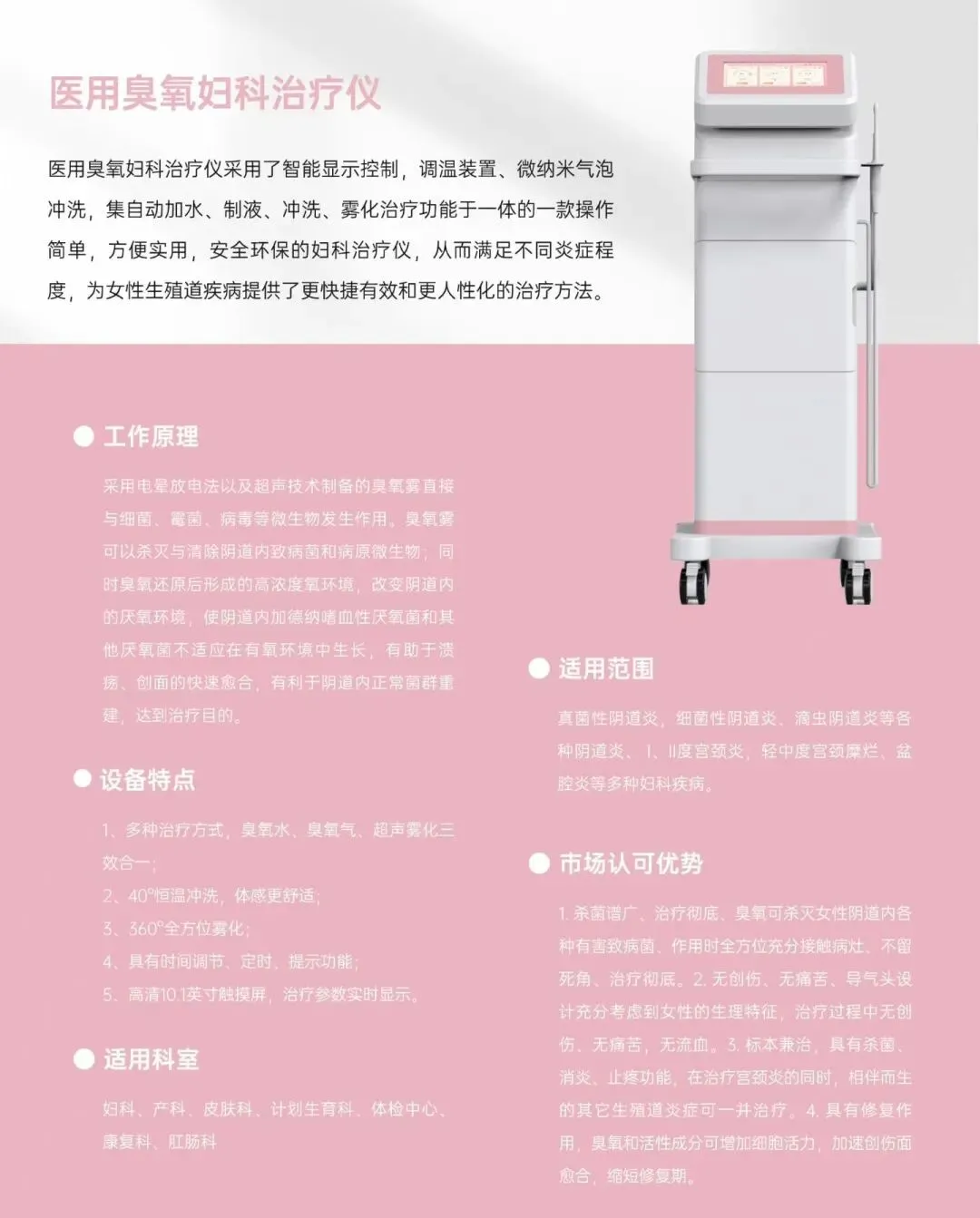 此次引进的医用臭氧妇科治疗仪,是当前妇科炎症与生殖道康复的主流物理治疗设备,集臭氧雾化、臭氧水冲洗、组织修复于一体,凭借广谱杀菌、无创温和、快速起效等优势,成为反复发作妇科炎症与术后护理的理想方案。该设备利用臭氧强氧化性,快速杀灭霉菌、滴虫、细菌、衣原体等致病微生物,同时不破坏阴道正常菌群与酸碱平衡,有效修复黏膜损伤、促进创面愈合、缓解瘙痒异味、减轻炎症疼痛。