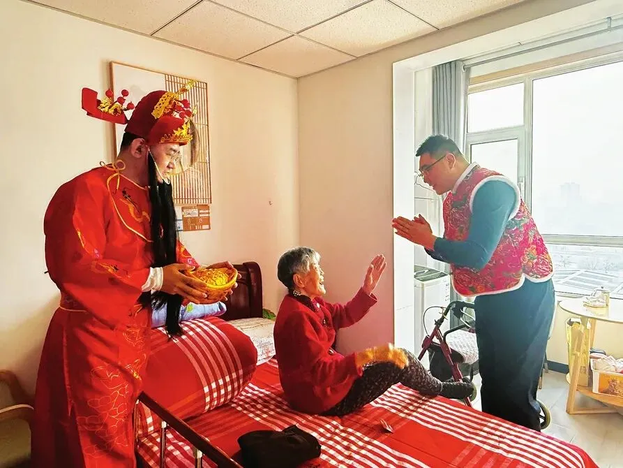 春节是一年光阴温情的收尾,也是万象更新的美好开端。为了让养老服务中心的老人们足不出户感受浓浓年味,尽享新春的暖心祝福,中心的工作人员精心策划了一场新春拜年活动。62岁的银桂花一听到外面的动静,便迫不及待地走出了房门。“财神爷”看到她,一边送上红包,一边中气十足地说:“银奶奶,过年好!祝您龙马精神,福寿安康!”银奶奶接过红包,忍不住伸手摸了摸“财神爷”的胡须,笑得合不拢嘴,道:“你扮的财神爷,看着就喜庆!”