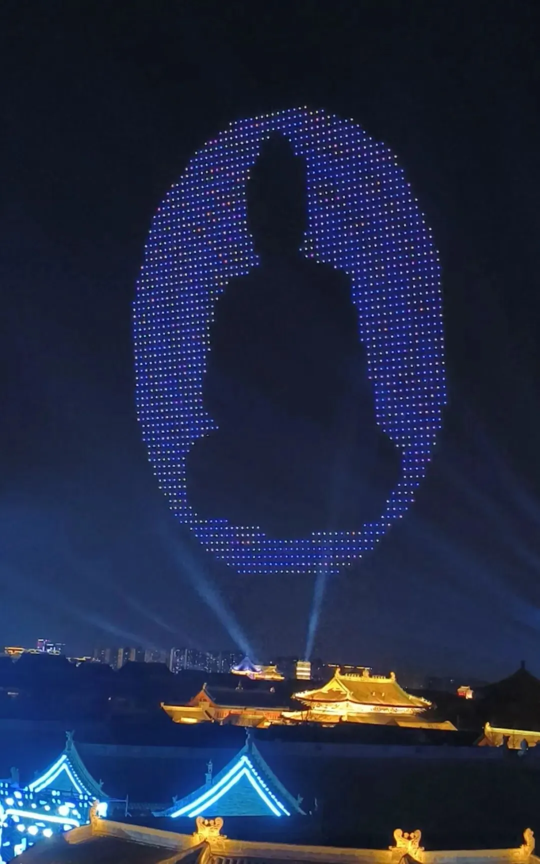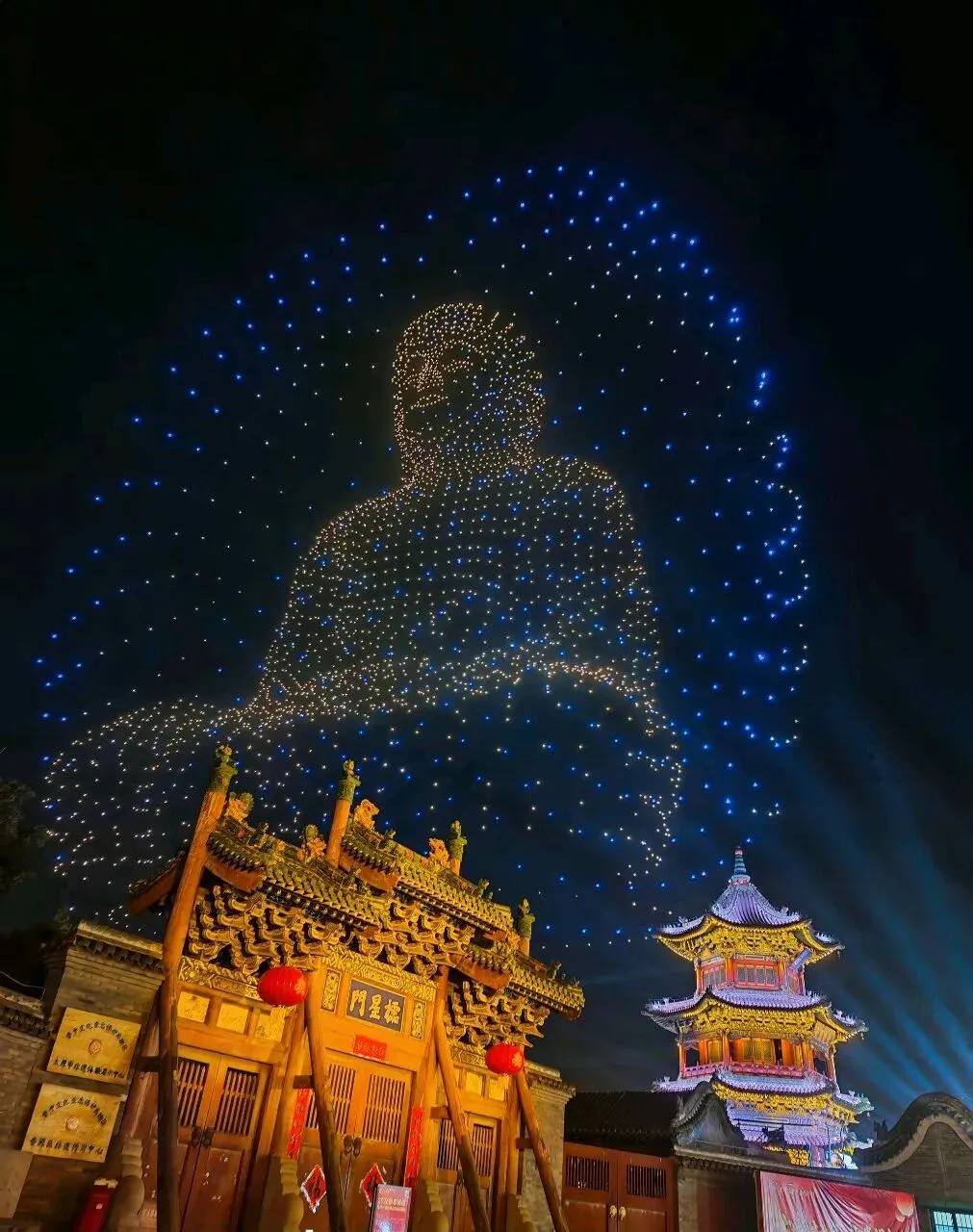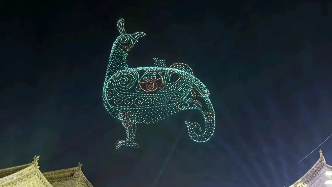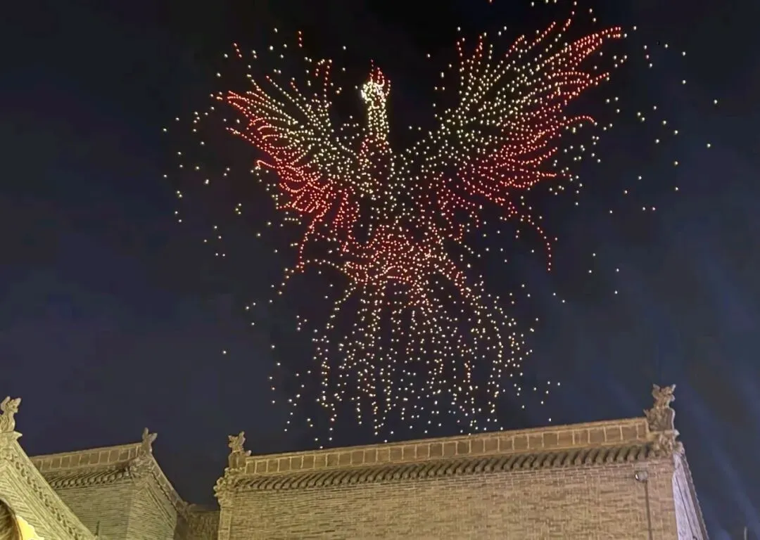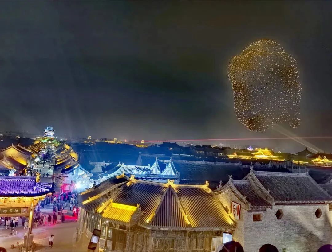 当夜色渐浓,3000架无人机腾空而起,以夜空为幕、以光影为笔,上演震撼人心的激光秀。永祚寺双塔巍峨挺立,晋侯鸟尊古韵流转,蒙山大佛庄严沉静,一个个山西文化符号在苍穹间缓缓铺展,科技与文脉在此完美交融。城墙灯光秀、市楼3D光影秀同步亮起,天地共绘、古今对话,每一次阵列变换都引来阵阵惊叹,每一幕光影流转都触动心底的文化共鸣。