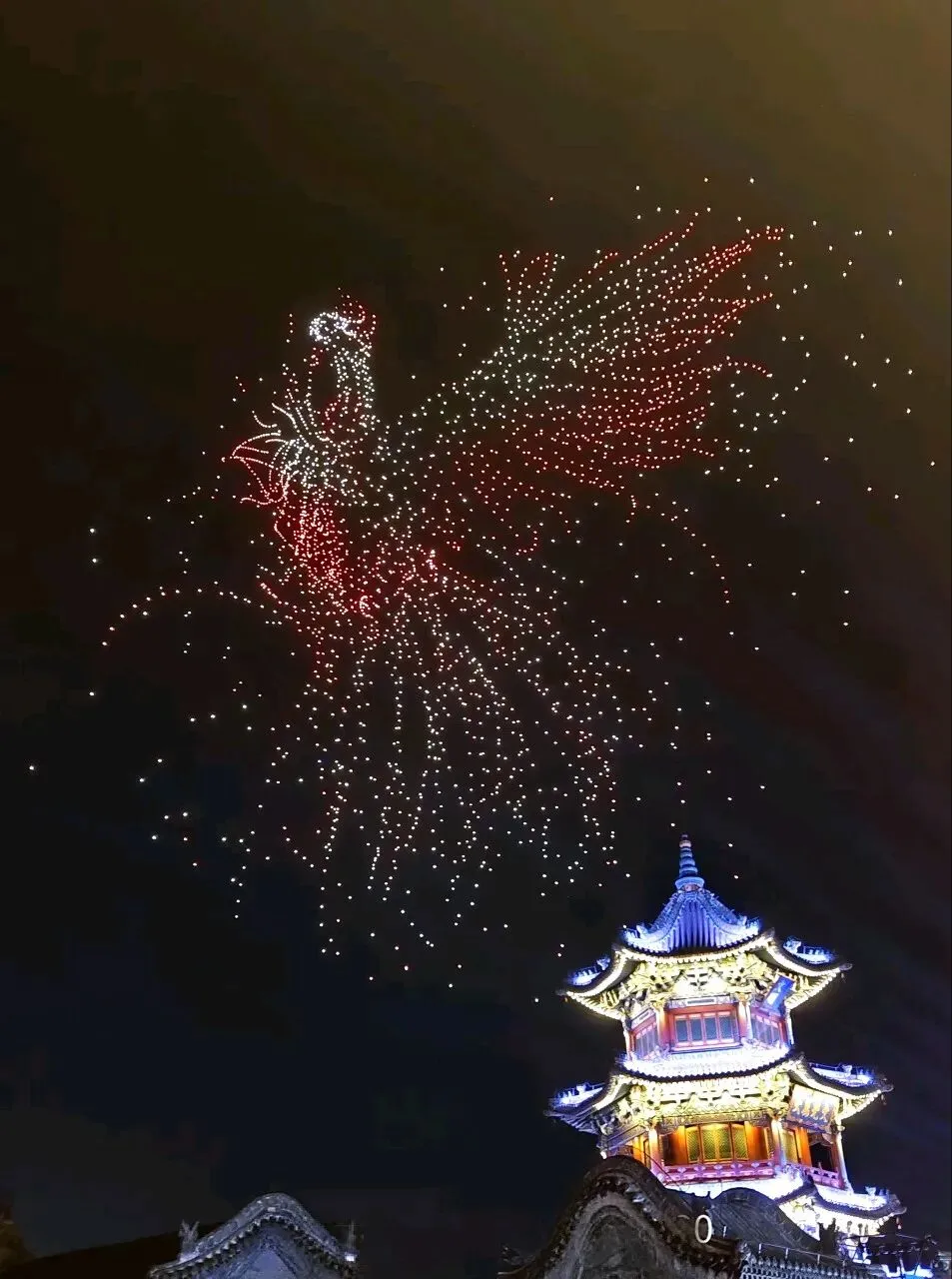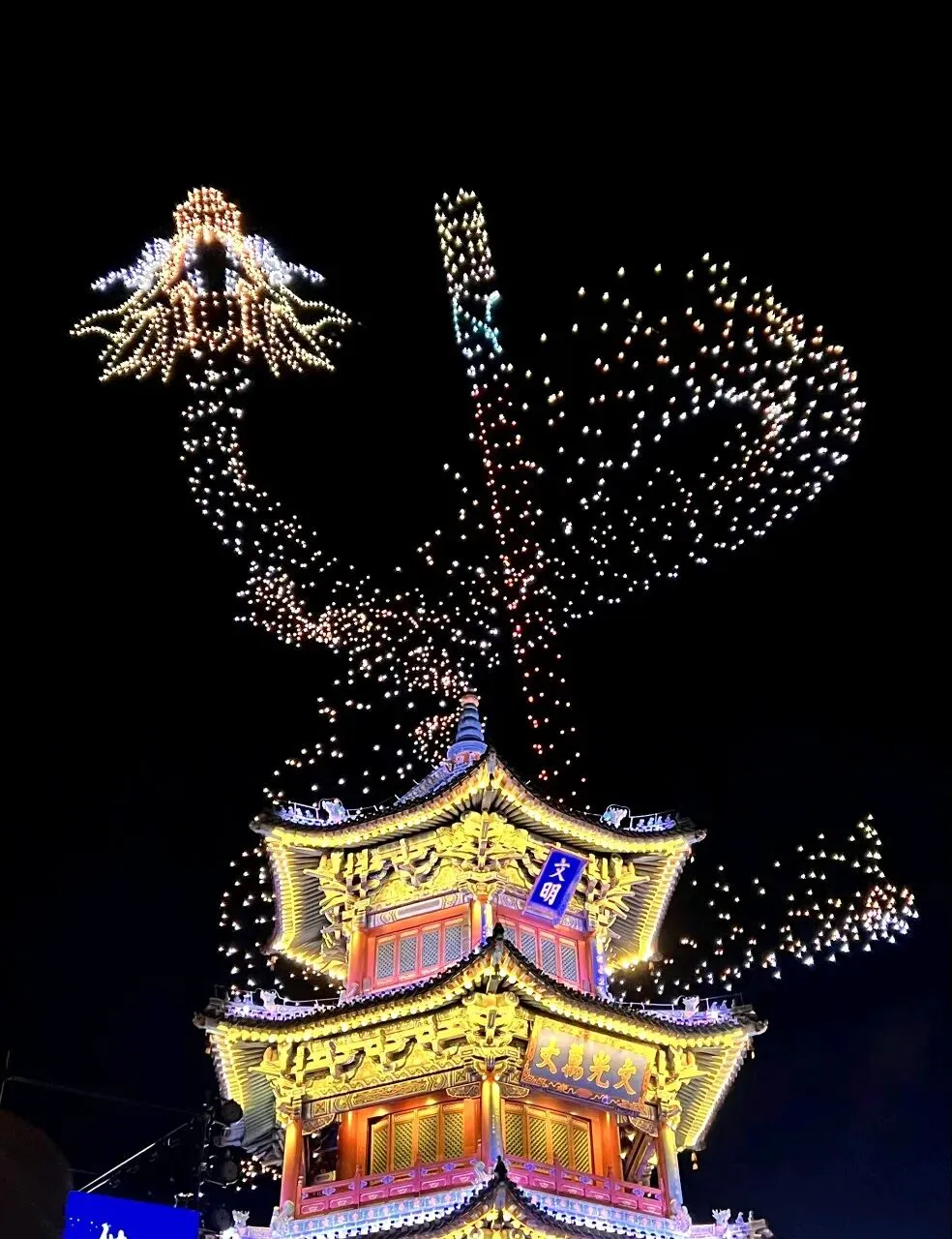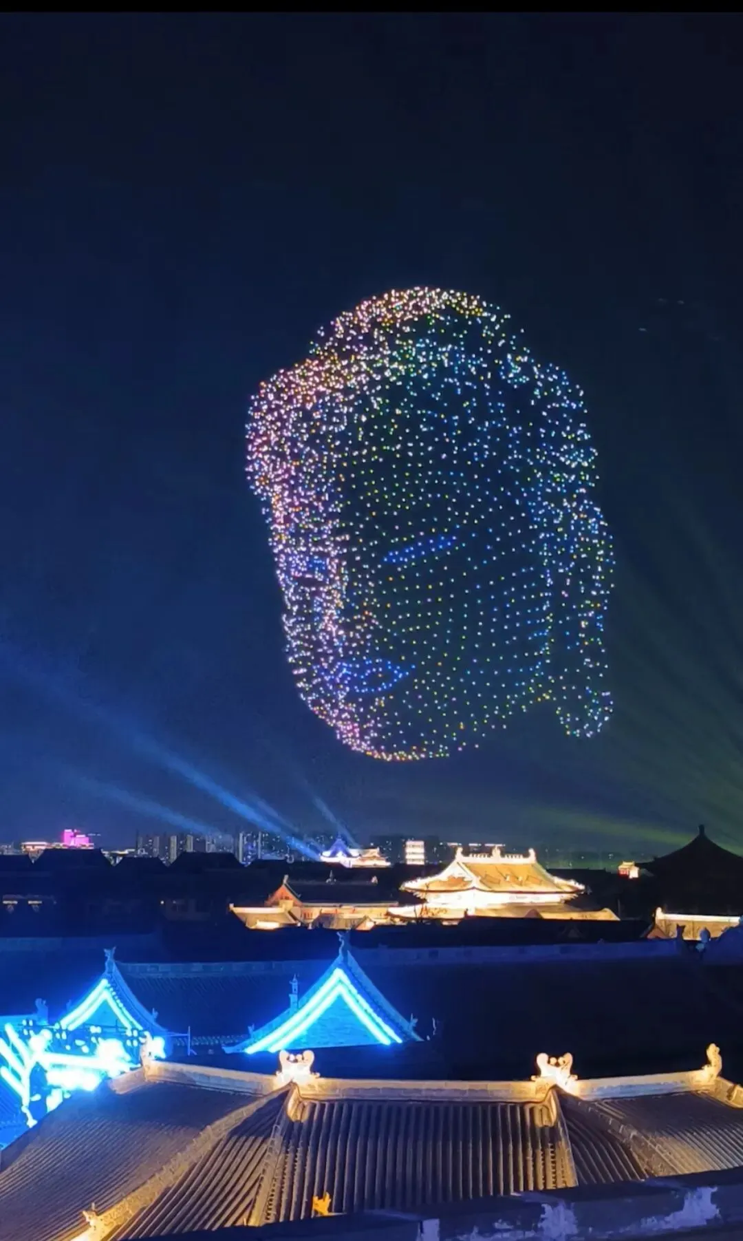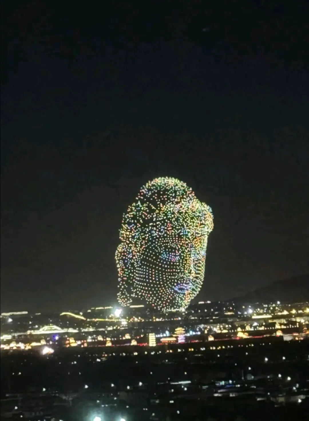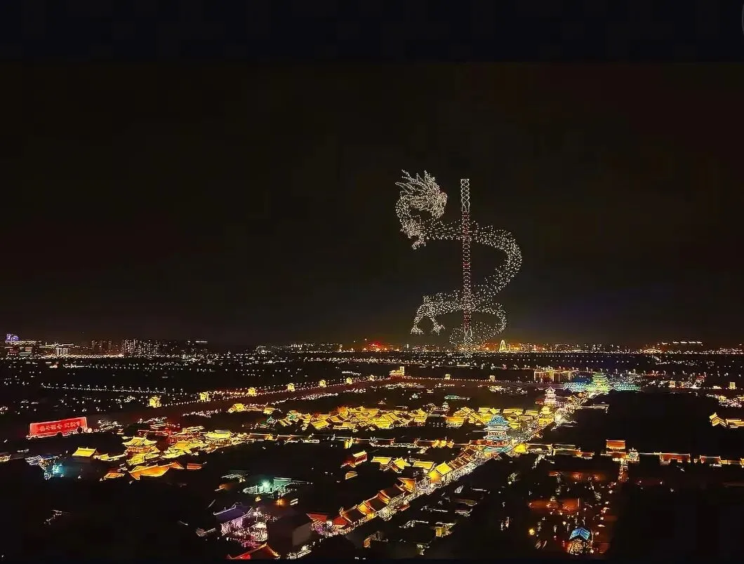 当夜色渐浓,3000架无人机腾空而起,以夜空为幕、以光影为笔,上演震撼人心的激光秀。永祚寺双塔巍峨挺立,晋侯鸟尊古韵流转,蒙山大佛庄严沉静,一个个山西文化符号在苍穹间缓缓铺展,科技与文脉在此完美交融。城墙灯光秀、市楼3D光影秀同步亮起,天地共绘、古今对话,每一次阵列变换都引来阵阵惊叹,每一幕光影流转都触动心底的文化共鸣。