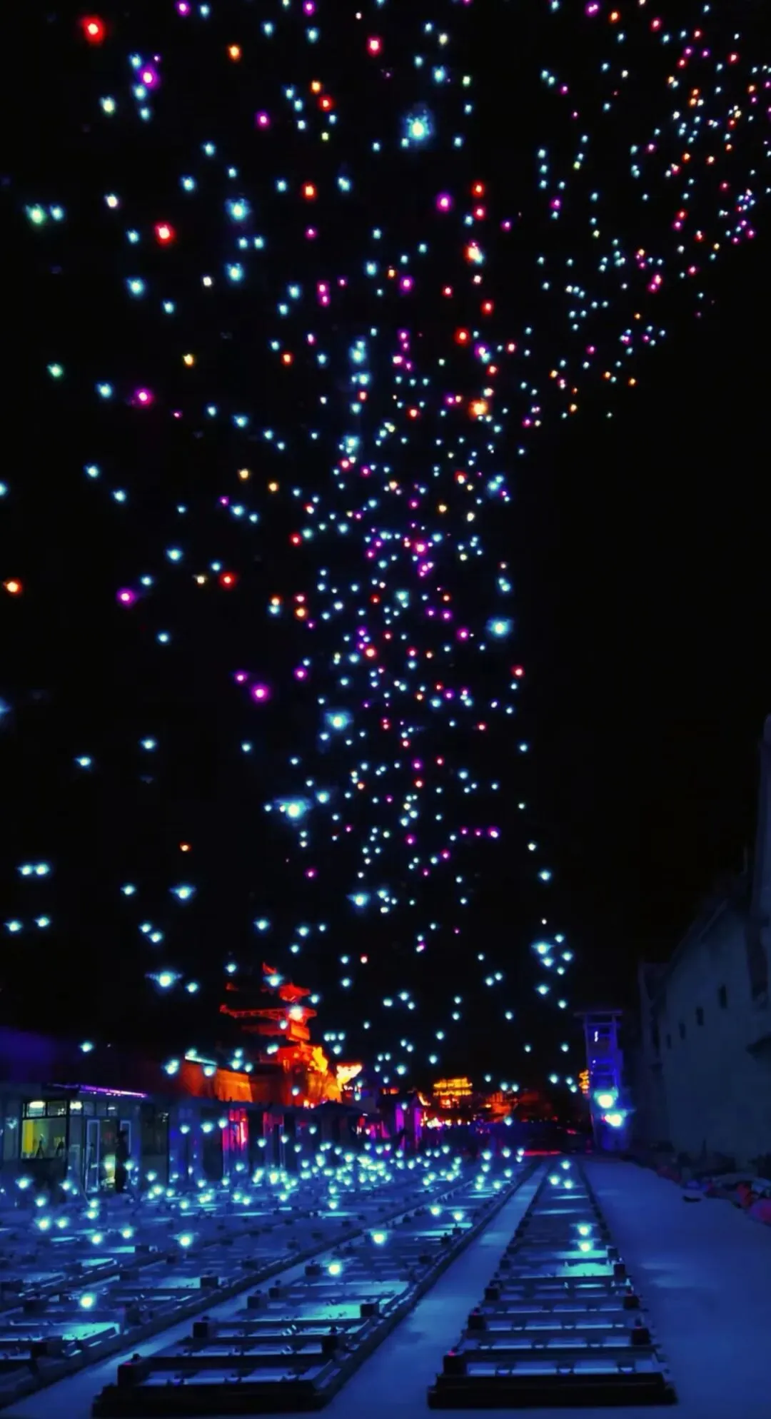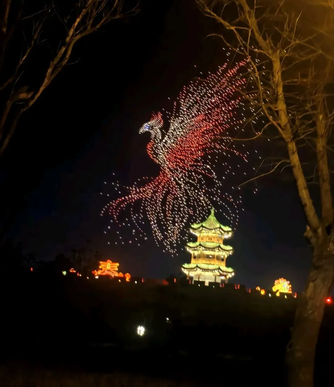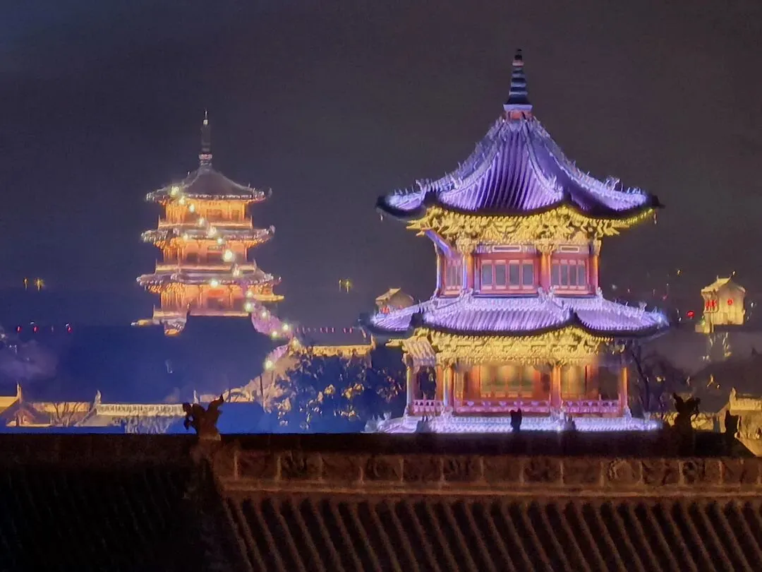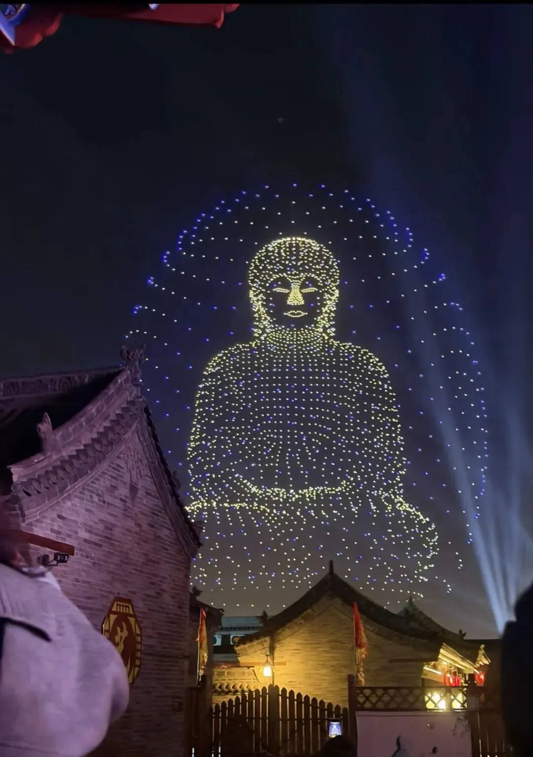 当夜色渐浓,3000架无人机腾空而起,以夜空为幕、以光影为笔,上演震撼人心的激光秀。永祚寺双塔巍峨挺立,晋侯鸟尊古韵流转,蒙山大佛庄严沉静,一个个山西文化符号在苍穹间缓缓铺展,科技与文脉在此完美交融。城墙灯光秀、市楼3D光影秀同步亮起,天地共绘、古今对话,每一次阵列变换都引来阵阵惊叹,每一幕光影流转都触动心底的文化共鸣。