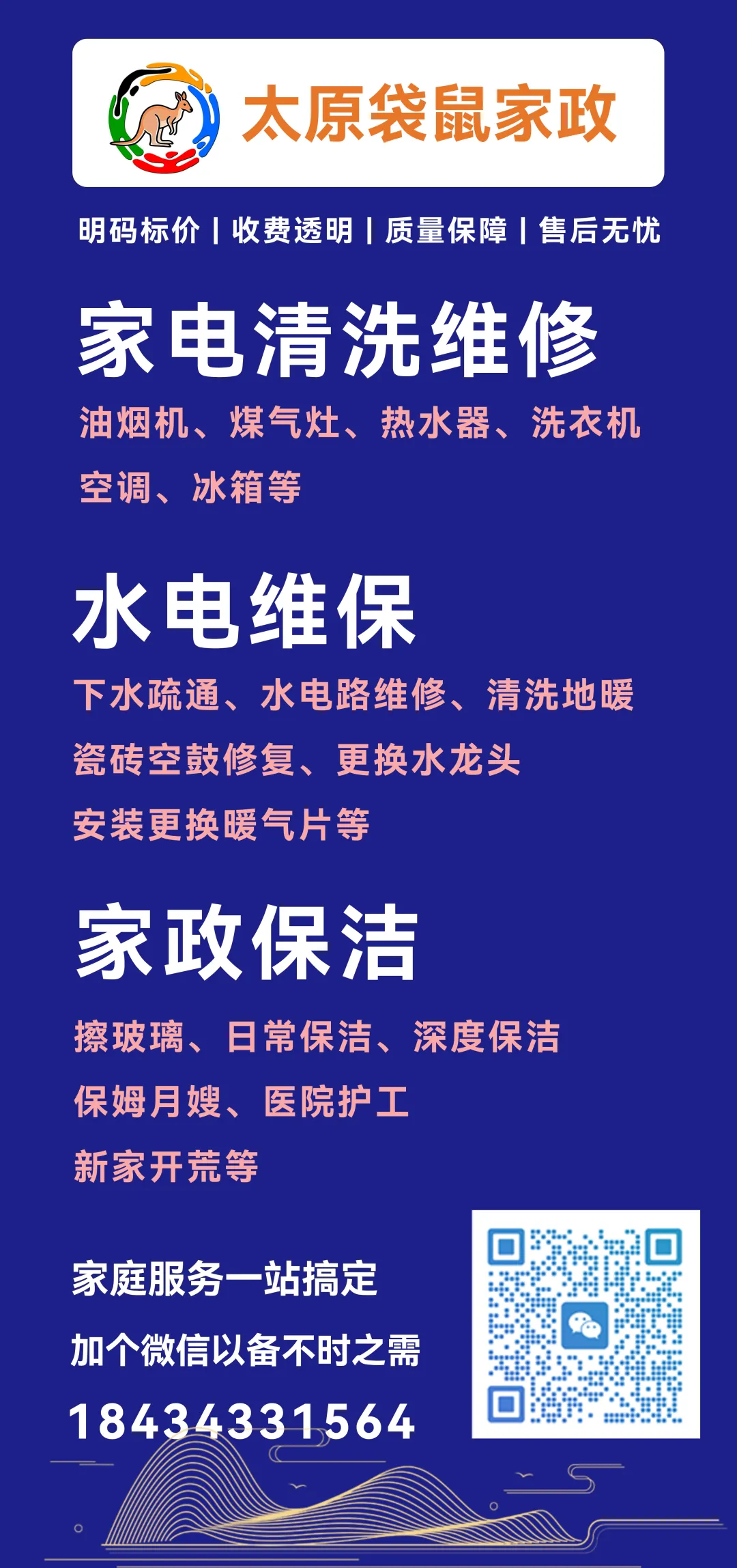 加个微信以备不时之需,太原袋鼠家政主营水电维修、家电清洗、家庭保洁等服务!