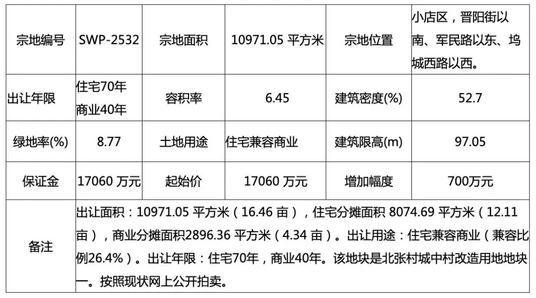 2026年太原市将城中村回迁安置列入民生实事重点推进,北张村城改已进入土地出让和开发阶段。2月24日,太原市规划和自然资源局网站发布了2宗土地拍卖信息,SWP-2532、SWP-2533均为北张村城改核心用地,土地用途为 用于 安置的商品住房用地(二类)。