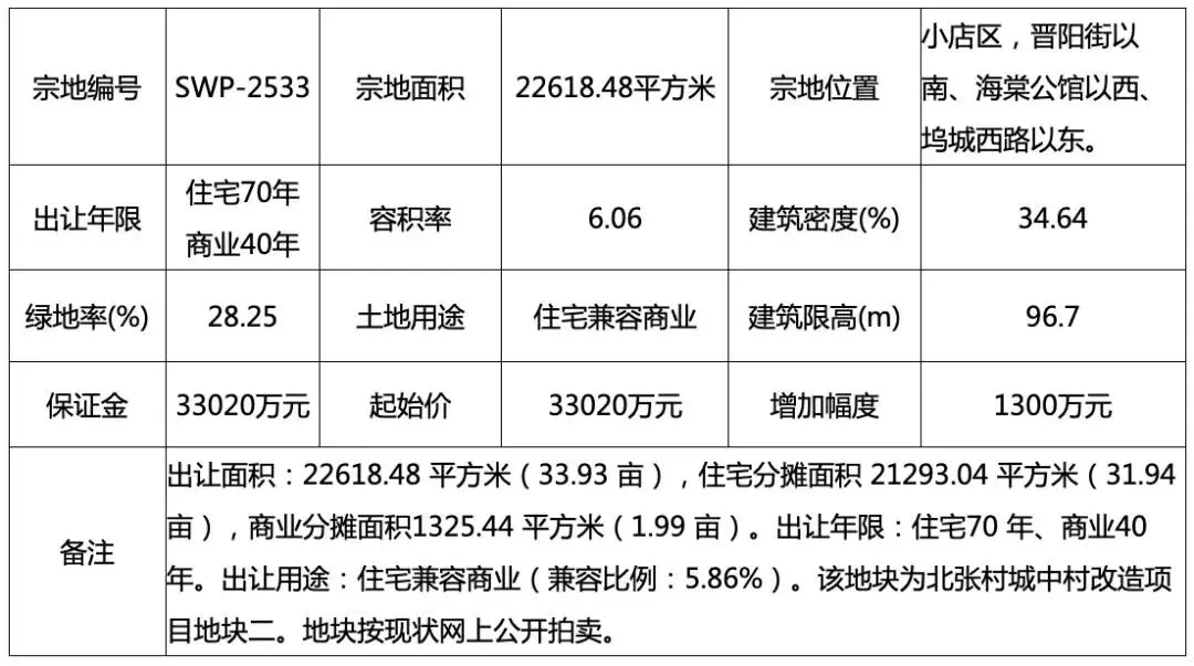 面积22618.48㎡(33.93亩),住宅/商业分摊面积21293.04/1325.44㎡,商业兼容比例5.86%;容积率6.06、建筑密度34.64%、绿地率28.25%、建筑限高 96.7m;保证金与 起始价均为33020万元 ,加价幅度1300万元。
