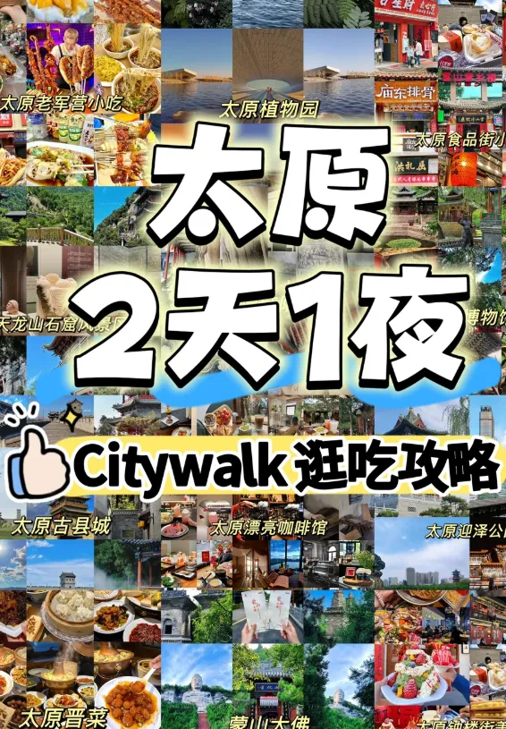 💕汪苏泷的兵,连夜给大家做了份太原2天1夜特种兵吃喝玩乐攻略!!!! 太原2日游行程: ✅Day1: 晋祠公园(包含晋祠博物馆)一天龙山 或者 太原植物园一蒙山大佛 晚上:太原古县城 ✅Day2: 上午:山西博物院一文庙一崇善寺 中午:钟楼街一食品街 下午:督军府一纯阳宫一永祚寺{双塔寺}—迎泽公园 晚上∶迎泽大桥(桥上桥下都很出片) ‼️公园可二选一 🍧关于美食: ✅太原人气小吃街有:老军营、义井小吃街、食品街,美好商场附近的夜市,里面都是价格不贵,味道不错的小吃。 ✅地道山西晋菜可以选:御河伍号·非遗太原菜(水西关店)、锦上云面馆、林香斋、清和元、杏花堂、老太原、炉玖、晋小福、三晋饭庄、土包滋 饭点不到就在排队啦,装修的很有特色,菜品不踩雷每道菜都很好吃,我们本地土著经常去的一家店,物美价廉,环境好服务好菜品更是没得挑。 👍 推荐菜品:糖醋丸子、过油肉、黄米凉糕、糖醋黄鱼、老太原铜锅等非常有特色的晋菜、饺子王真的一定要试一下!👊🏻大小皮薄馅多,最后一定要来一份老太原炝锅面!! ✅太原人气咖啡馆:goodate、青山咖啡馆、小满咖啡、HC咖啡、至乐咖啡、朴寂1990、神麻籍CHEZMAKI、NIFFLER CAFE、山上咖啡 🎁 关于伴手礼: 吕梁野山坡沙棘汁、平遥牛肉、汾酒、柳林碗托、海玉石头饼、晋南烤馍、运康锅巴、沁州黄小米、定襄蒸肉、山西醋坛子、陈醋可乐、超市都可以买到 🏨 关于住宿: 新城区可以选择住在万象城附近,去哪都很方便!也可以住在晋阳湖附近,离红灯笼不远,出门附近有公交可以直达,打车也很方便! 老城区推荐钟楼街,柳巷附近