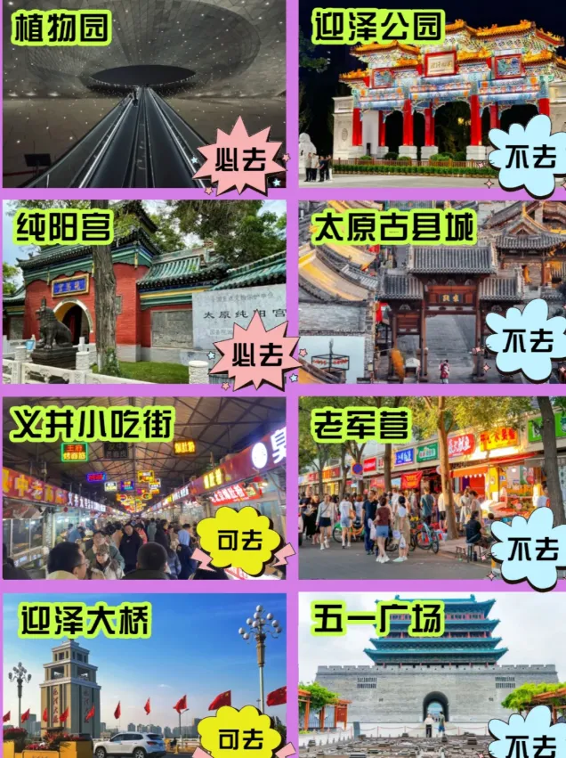 📍红榜推荐✅ 1️⃣ 景区篇 ○ 晋祠博物馆:中国现存最古老的皇家祭祀园林,古建筑与自然山水完美融合,圣母殿的彩塑堪称一绝!记得租讲解器(20元/个)或跟导游,历史控必冲! ○ 双塔寺:太原地标古建,外围有超大公园,都非常出片,门票仅需30元值回票价~ ○ 钟楼街:太原必去城市地标,人流如织,有很多老店,交通便利,可逛可玩可吃可住!老鼠窟的元宵一定要尝一尝。 ○ 山西省博物院:馆藏文物30万件,精品文物数不胜数,是了解山西文化的窗口。 ○ 太原植物园:自然与科技的完美结合,适合傍晚前往,天色渐暗,灯光点点,宛如通往未来的道路。 ○ 纯阳宫:被低估的宝藏之地!无论建筑、历史、文化、文物都堪称精华,山西7件不可出境的文物,这里就占了2件。 2️⃣ 交通篇 ○ 公交+共享单车:晋祠、山西博物院等景点公交直达(79路、301路等),市区内共享单车灵活方便,省钱又环保! ○ 包车/拼车:景点分散,包车更省时。 3️⃣ 美食篇 ○ 各类面食:宽薄筋道,推荐老字号“太原面食店”,搭配臊子绝了! ○ 羊杂割:山西人冬日的白月光,早晨一碗,温暖一天,可以搭配饼子和麻花! ○ 丸子汤:太原人最爱的早餐,丸子汤、烙饼、小咸菜,三件套,值得一尝。 ○ 老豆腐:和丸子汤平分天下,推荐蒸碗老豆腐,滑嫩爽口。 ○ 太钢汽水:太原孩子的童年,虽然味道平平,但情怀无价! 🚫黑榜避雷❌ 1️⃣ 景区篇 ○ 天龙山网红桥:距离远,交通不便,还经常封路,不值得专程前往。 ○ 柳巷夜市:和钟楼街、食品街等同质化严重,小吃种类多但卫生参差,价格虚高,交通混乱。 ○ 五一广场:改造后失去了原有的活力,新建的城楼不足以支撑起太原的精神文化需求。 ○ 老军营:网红小吃扎堆,没有太原特色,价格越来越贵。