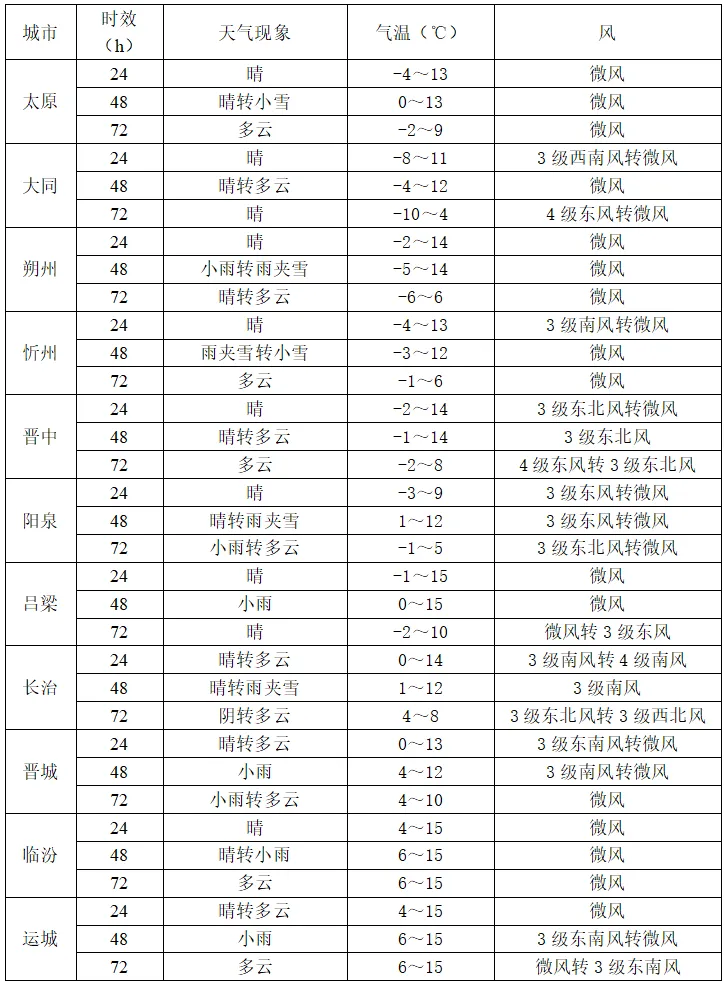 全省阴天转多云,大同、忻州、阳泉、晋中、长治局部有雨夹雪或小雪;临汾、运城、晋城局部有小雨或雨夹雪。