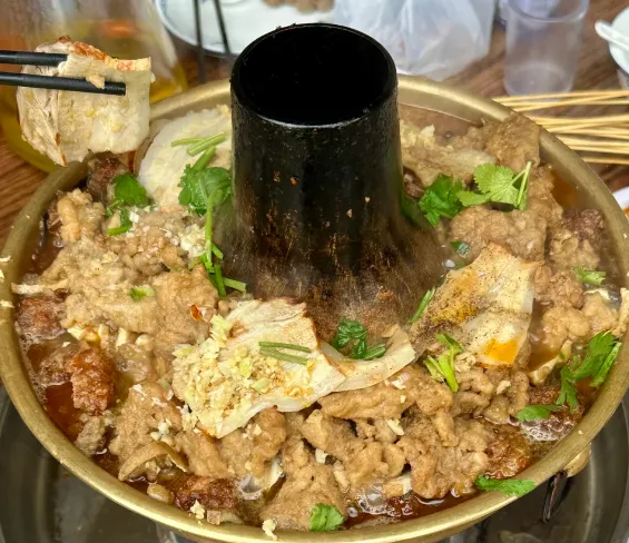 这火锅不是涮的,是“装”好的。一口复古的铜锅,炭火在中间滋滋作响。锅里一层层码好了炸豆腐、炸肉丸、粉条、海带和五花肉片,高汤煨着,咕嘟咕嘟冒泡。那肉片肥而不腻,吸饱了汤汁的豆腐一咬一嘴油。不用蘸料,原汤化原食,一口下去,胃里那个暖和劲儿,能一直透到后背。