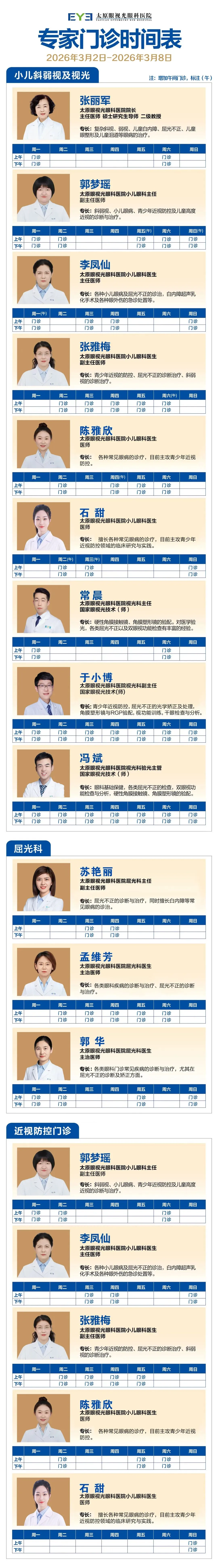 太原眼视光眼科医院 2026年3月2日 - 2026年3月8日门诊排班表
