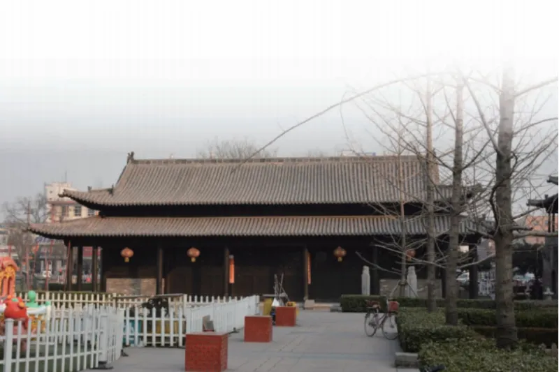 除了规模宏大,参考法国汉学家沙畹1907年10月7日所拍太原城隍庙老照片可知,当年太原城隍庙的建筑形制十分讲究,两侧为八字墙,典型的山西清代建筑样式;照片中还可看出,当时东牌楼尚存,为四柱三楼式结构,前后用戗柱支撑,歇山屋面,正中匾额上“灵通元造”四个大字依稀可辨;山门为硬山顶,位置比现存钟鼓楼纵轴线向南突出;二道门为悬山,明间前檐柱盘龙;大殿面阔三间设围廊,重檐歇山顶。历史照片充分证明,当年的太原府城城隍庙建筑,堪称恢宏大气、富丽堂皇。