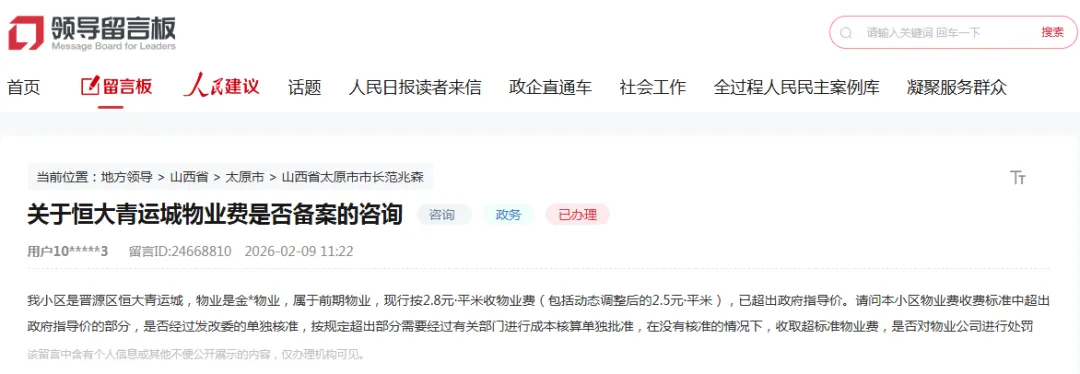 记者从人民网领导留言板获悉,网友反映太原市恒大青运城小区物业服务现行按2.8元·平米收物业费(包括动态调整后的2.5元·平米),已超出政府指导价,并进行咨询。