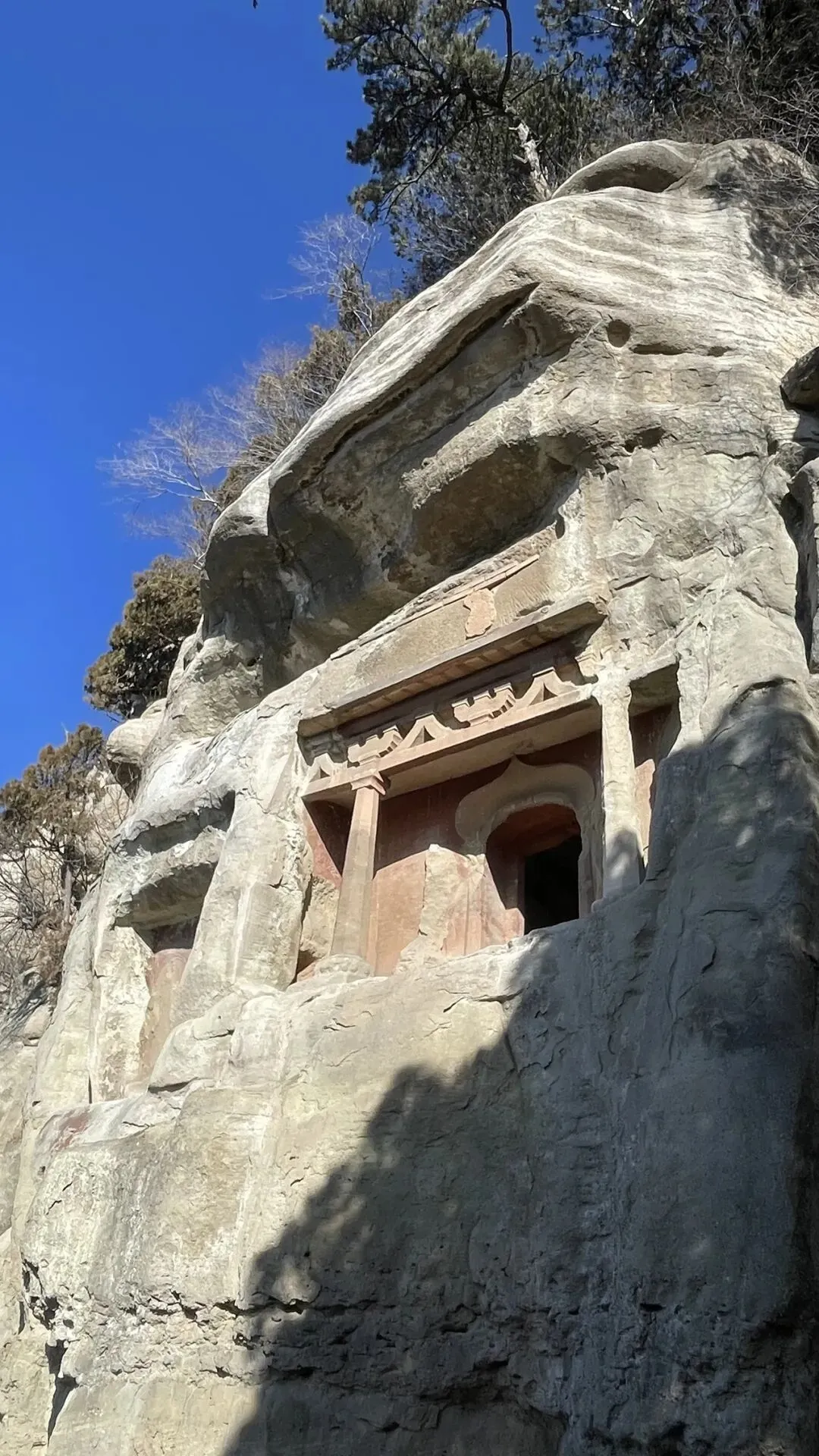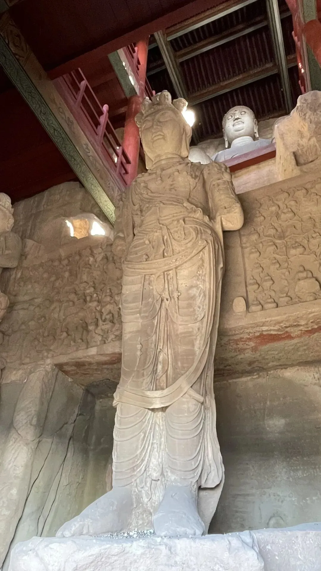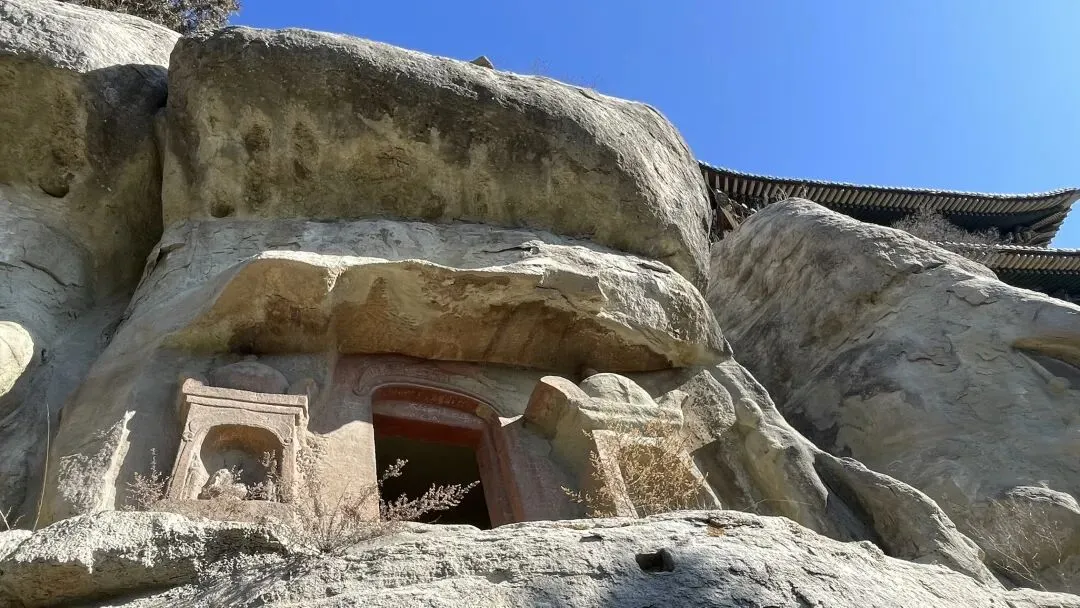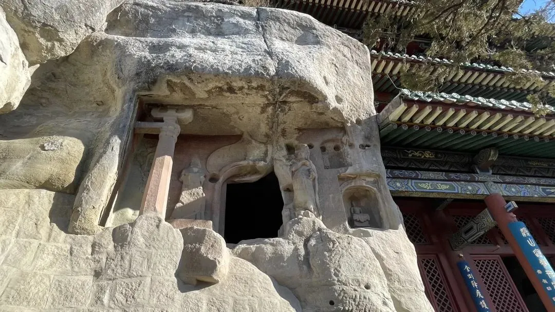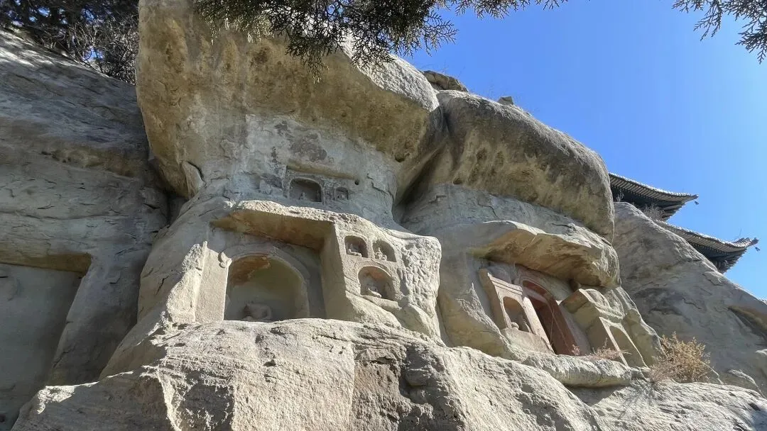 沣同学对于空间结构极敏感,发现天龙山的石窟摩崖而建,外沿大多有屋檐榫卯的痕迹,于是判断这些石窟外围当年应该都有崖阁,阁后洞窟类似佛龛,各窟有栈道相连,类似悬空寺。后来查证,果然如此。