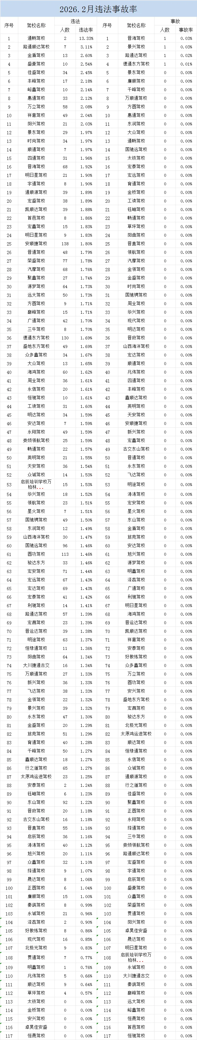 根据公安部交管局工作要求,现向社会公布辖区机动车驾驶人培训学校培训合格率、考试员考试质量、违法事故率等情况。