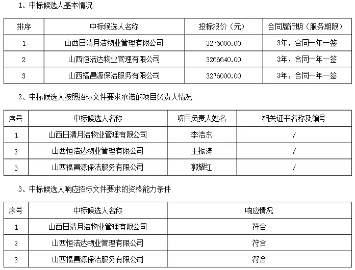 本太原市第三人民医院保洁服务项目(招标项目编号:M1100000048005234001),经评标委员会评审,确定001第一包的中标候选人,现公示如下: