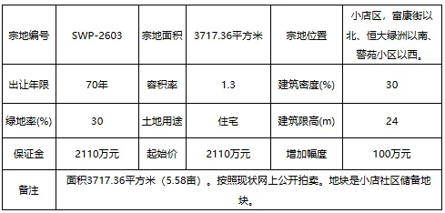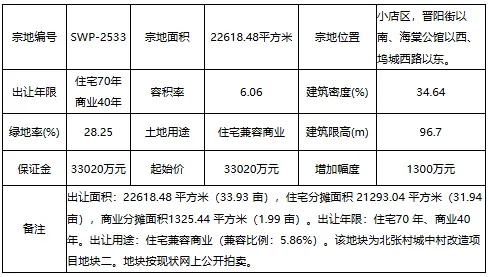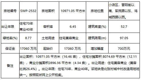 小店区,晋阳街以南、海棠公馆以西、坞城西路以东。宗地出让面积为22618.48 平方米(33.93 亩),住宅分摊面积 21293.04 平方米(31.94 亩),商业分摊面积1325.44 平方米(1.99 亩)