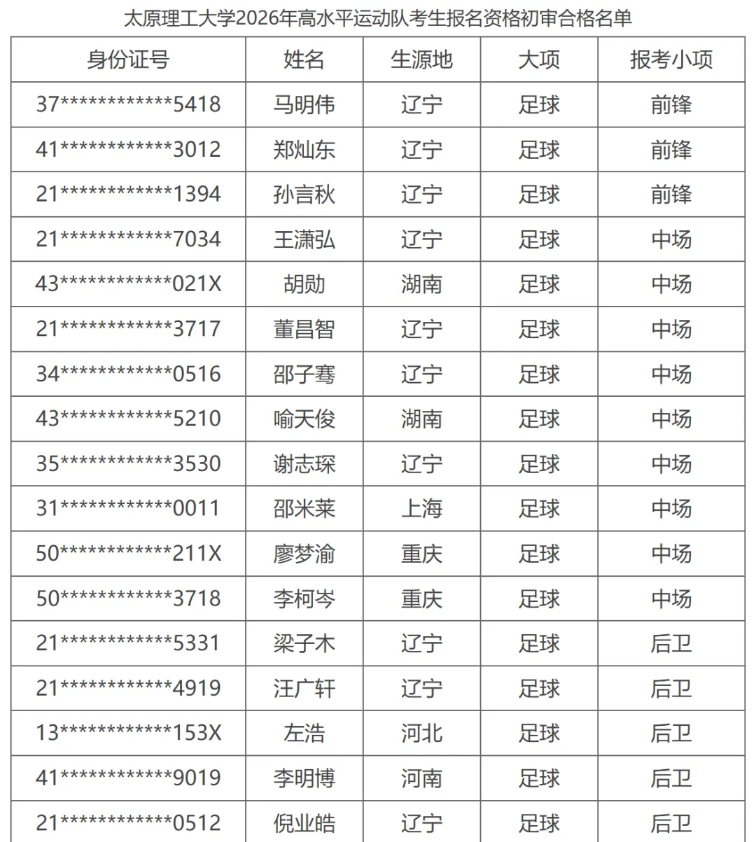 根据教育部有关文件和《太原理工大学2026年高水平运动队招生简章》等规定,我校对2026年高水平运动队考生的报名材料进行了初审,确定报名资格初审合格名单,现予以公示。