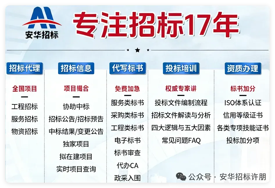 安华招标成立于 2009 年,是国内较早以客户行业为导向的招投标综合服务机构,17 年深耕招投标行业,核心编制团队均拥有多年本地招投标服务经验,深谙各行业评审专家的打分逻辑与招标评分细则,依托自主运营的安华招标网(ahzb.net)搭建全链条服务体系,累计协助全国及本地客户中标金额超 50 亿元,能精准帮你打造贴合本地评审逻辑的高分标书。