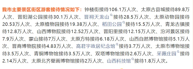 ←点击图片查看详情。市文旅局24日发布消息,春节长假期间,我市主要景区、博物馆、公园、旅游休闲街区、夜间文化和旅游消费集聚区接待市民游客681.7万人次,同比增长35%,门票(营业)收入11535.4万元,同比增长24.7%。来源:太原晚报