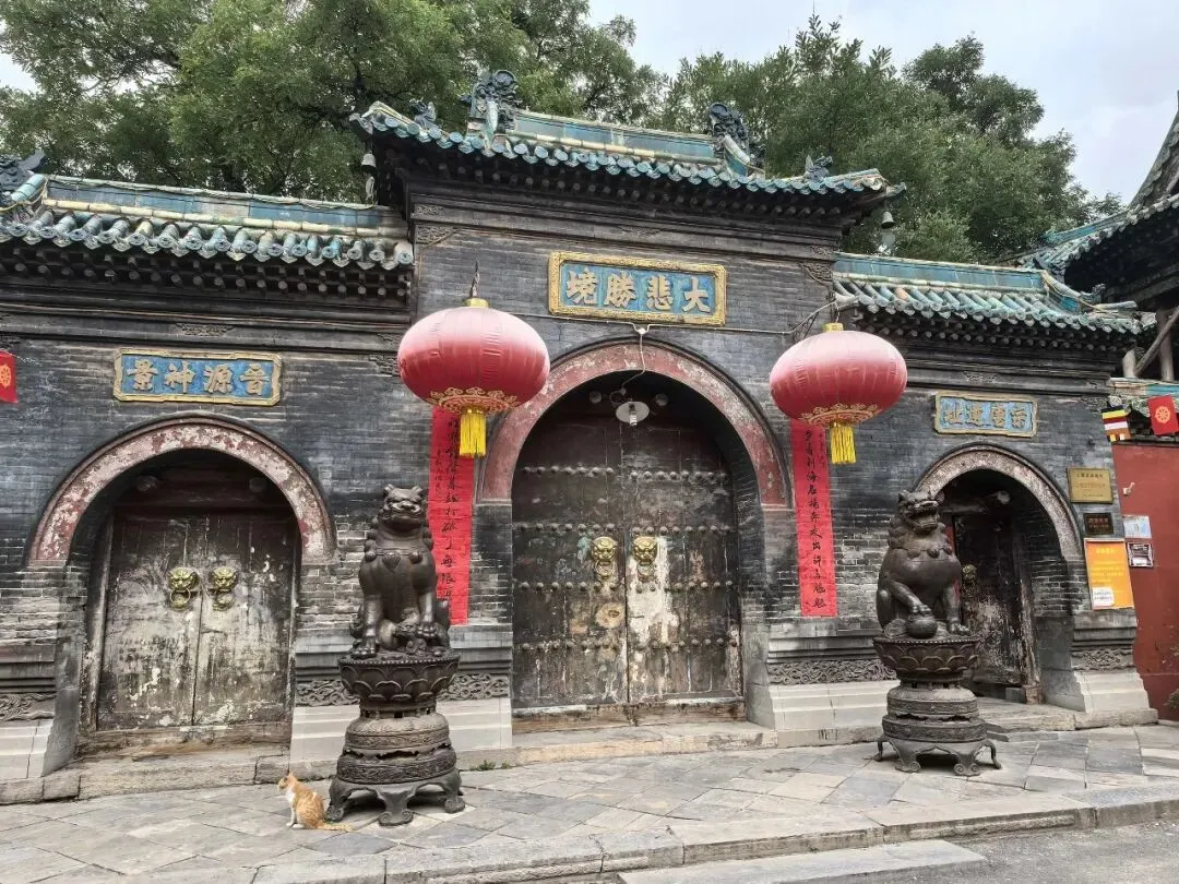 山门为无梁密檐式的砖石结构,古朴庄严又大气,三个门额上书“大悲胜境”、“宗唐遗址”、“晋源神景”,门前一对铁狮,为明洪武年间铸造。