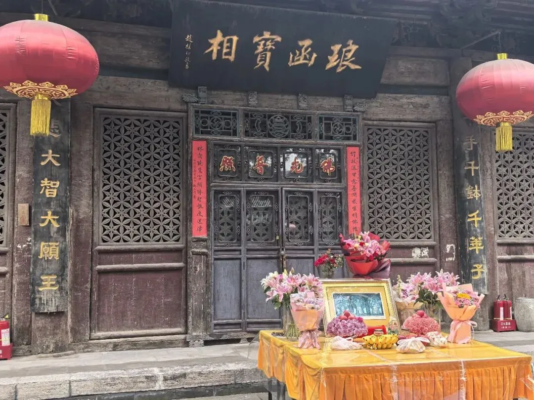 只是现在大悲殿并不开放,殿门紧闭,这些宝贝都无缘得见,只在殿前供桌上摆有那三尊菩萨像的照片供人们瞻仰。