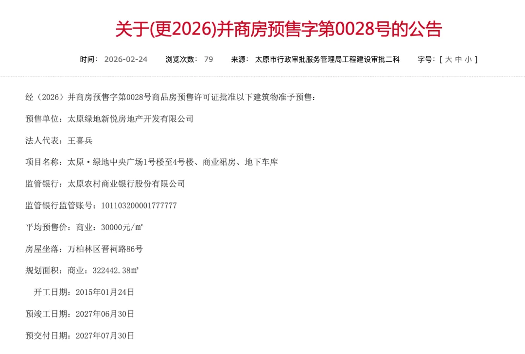 绿地开发的绿地中央广场(原绿地外滩中心),位于万柏林区,紧邻汾河,南有长风商务区,北靠迎泽政务区。按照当初规划,绿地中央广场项目由4栋楼组成,1-3层为连体的商业裙楼,规划有五星级酒店、公寓、写字楼、商业组成。2015年开工建设,2016年启动预售,但曾因无证预售被监管部门处罚。2018年,因第三方机构违规分割销售商铺,后由绿地集团接管。2020年,1号楼在未完成消防验收情况下交付,2-4号楼进入停工状态。随后,绿地集团多位领导多次现场考察项目,并提出“复工要求”,但截止2025年底均未复工。2026年2月5日,太原绿地外滩中心挂出复工条幅与万豪酒店入驻条幅,是万柏林区打造汾河西岸高品质中央商务区规划下的项目推进信号,也是继多次 “复工无果” 后的又一轮动态释放。此前,万柏林区2026年政府工作报告提出打造汾河西岸高品质中央商务区,为项目复工提供政策推力。根据条幅来看,万豪酒店拟入驻项目酒店业态,若落地将成为山西第二家万豪系奢华酒店,与太原JW万豪(小店区,2024 年开业)形成南北布局。太原市行政复议规定局发布了《关于(更2026)并商房预售字第0028号的公告》,经(2026)并商房预售字第0028号商品房预售许可证批准,太原·绿地中央广场1号楼至4号楼、商业裙房、地下车库,准予预售。预竣工日期:2027年06月30日