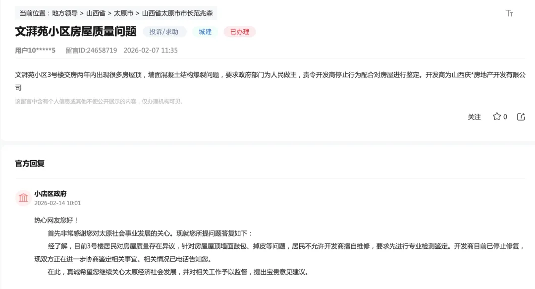 太原一楼盘交房刚2年,发生质量问题!官方如此回复~