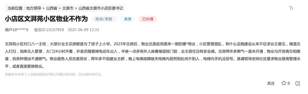 2023 年交房后,燃气迟迟未通,业主无法正常做饭。2025年6月官方通报:经多轮排查,通气率仅50%,剩余因业主未联系、需整改或暂不接通。2、物业管理问题