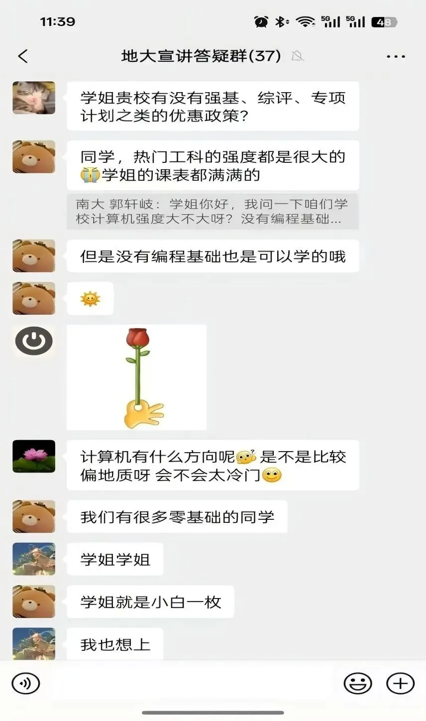 在答疑群里,家长和同学们的问题接踵而至:“地大的保研率怎么样?转专业难度大吗?”“计算机专业强度大不大?没有编程基础可以选吗?”“选了史化地,有什么专业推荐?”我们化身“地大代言人”,用亲身经历和详实数据逐一解答——保研率在211高校中表现亮眼,计算机等热门工科虽有挑战但零基础也能从容起步,史化地组合也能找到适配的特色专业,野外生存课等特色课程更是让大家充满向往。
