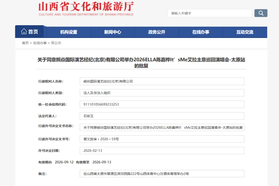 2026ELLA陈嘉桦It’sMe艾拉主意巡回演唱会太原站审批通过,举办时间: