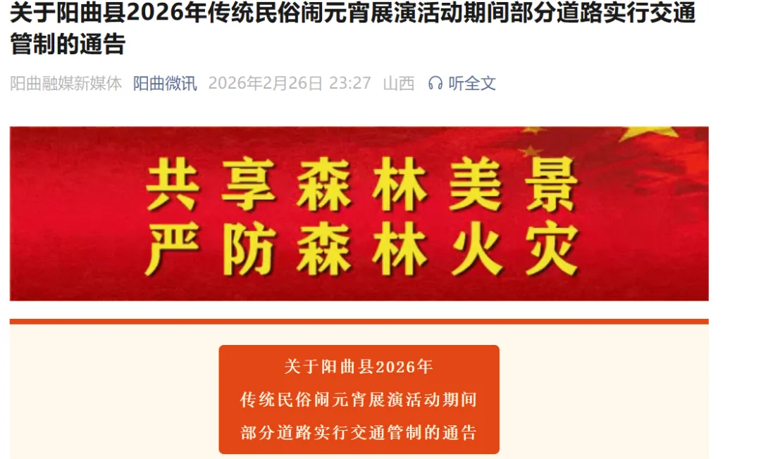 2月26日,阳曲县公安局交通管理大队发布,关于阳曲县2026年传统民俗闹元宵展演活动期间部分道路实行交通管制的通告。