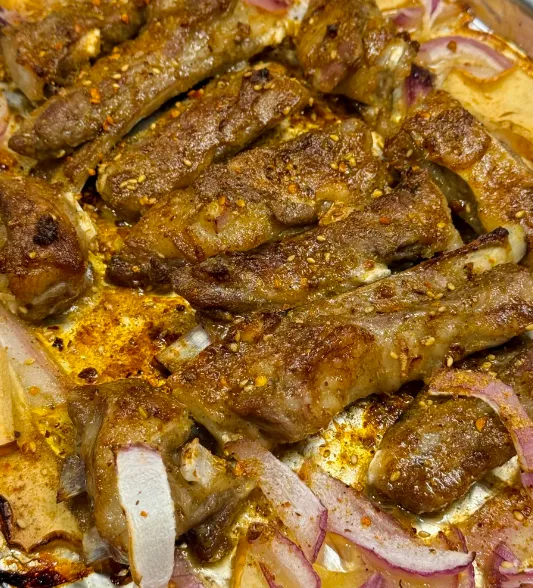 右玉烤羊排:做法极简,不搞复杂的腌制。选当年生的羔羊排,抹上点盐和胡椒,直接上火烤。外皮烤得焦黄冒油,咬下去“咔嚓”一声,里面的肉汁“呲”地冒出来,嫩得烫嘴。不需要孜然盖味,吃的就是那口原原本本的肉香。