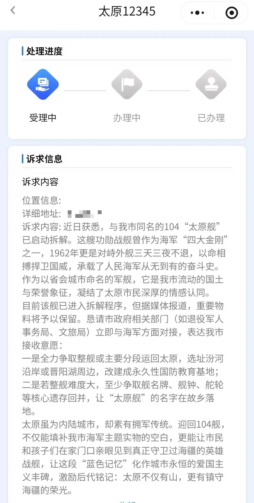 太原虽为内陆城市,却素有拥军传统。迎回104舰,不仅能填补我市海军主题实物的空白,更能让市民和孩子们在家门口亲眼见到真正守卫过海疆的英雄战舰,让这段"蓝色记忆"化作城市永恒的爱国主义丰碑,激励后代铭记:太原不仅有山,更有镇守海疆的荣光。