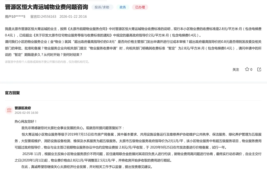 恒大青运城位于太原市晋源区滨河西路与健康南街交汇处,山西体育中心南门正对面。由太原恒大德盛房地产开发有限公司开发,2019年建成、2020年精装交付。其物业为金碧物业有限公司太原分公司(恒大体系物业);前期备案为五级 + 超五级服务(基础五项五级,大型景观/水系/消防维保为超五级),2020年9月在太原市发改委完成2.8 元/㎡・月的收费备案。此前,有业主多次在网络反应“质价不符”,如水系规模、消防费用单独核算的合理性。近日,有市民咨询:恒大青运城物业费问题,具体如下:我是太原市晋源区恒大青运城的业主,按照《太原市前期物业服务合同》中对晋源区恒大青运城物业收费标准的说明,现行本小区物业费的收费标准是2.8元/平方米·月(包含电梯费0.4元),已经超出《关于印发太原市住宅物业服务等级与收费标准的通知》中规定的最高政府指导价2元/平方米·月(包含电梯费0.4元)。请问我们小区的物业服务企业(金*物业)就其“超出政府最高指导价的0.8元”是否向价格主管部门发出申请并进行过成本审核?超出政府最高指导价的0.8元是否得到发改委及相关部门的审批、批准和备案?物业服务企业向相关部门提交“物业服务收费申请”时,向相关部门明确其收费标准“暂定”为2.8元/平方米·月(包含电梯费0.4元),请问申请中的所说的“暂定”期限是多久?从何时开始?到何时结束?首先非常感谢您对太原社会事业发展的关心。现就您所提问题答复如下:恒大青运城小区物业服务等级于2019年7月15日在市房产局备案,其中基本要求、共用设施设备运行及维修养护协助维护公共秩序、保洁服务、绿化养护管理为五级服务,大型景观维护、消防设施设备检测、维保及水系服务为超五级服务。太原市五级物业服务政府指导价为2元1月/平,该小区物业服务中有超五级服务项目,物业服务费用可超过政府指导价,物业与业主签订前期物业服务协议中也约定物业费按 2.8元/月/平收取,于 2020年9月25日在市发改委进行价格备案,试行一年。2025年 11月,根据业主反映小区物业服务质价不符问题,区住建局联合金胜镇对其项目负责人进行约谈,就物业费用高问题进行协商,最终实行动态调价,自业主交付之日(2020年1月1日)起,物业费价格由2.8元1月/平调整至2.5元1月/平,并将收房开始多收取的费用进行顺延。恒大青运城物业费从2.8元/㎡・月降到2.5元/㎡・月,基本和太原目前主流中端改善小区物业费持平。从交房日起追溯抵扣,是政府介入、业主维权、物业整改三方共同推动的结果:程序上合规,价格上调整,服务上约束,对业主来说是有理有据、落到实处的结果。