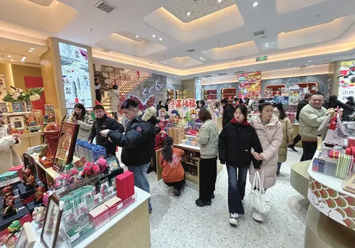 图为2月26日,钟楼街一家文创店内,不少游客正在挑选商品。 邓寅明 摄