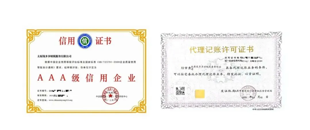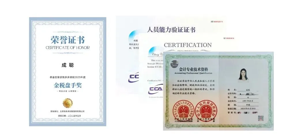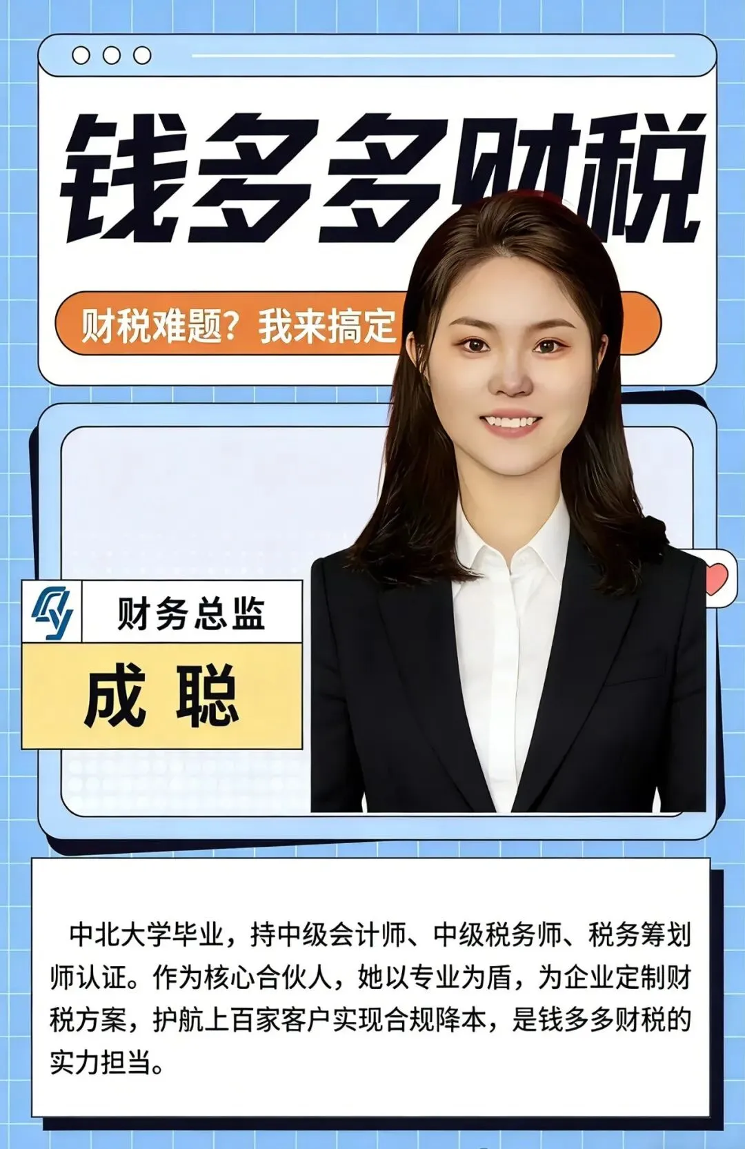 我们还是 AAA 级信用企业,专注财税行业多年。更值得一提的是,由成聪老师带队,她是钱多多财税公司合伙人、财务总监,毕业于中北大学,持有中级会计师、中级税务师、税务筹划师等证书,专业能力过硬,能为企业量身定制财税方案,助力企业合规降本。