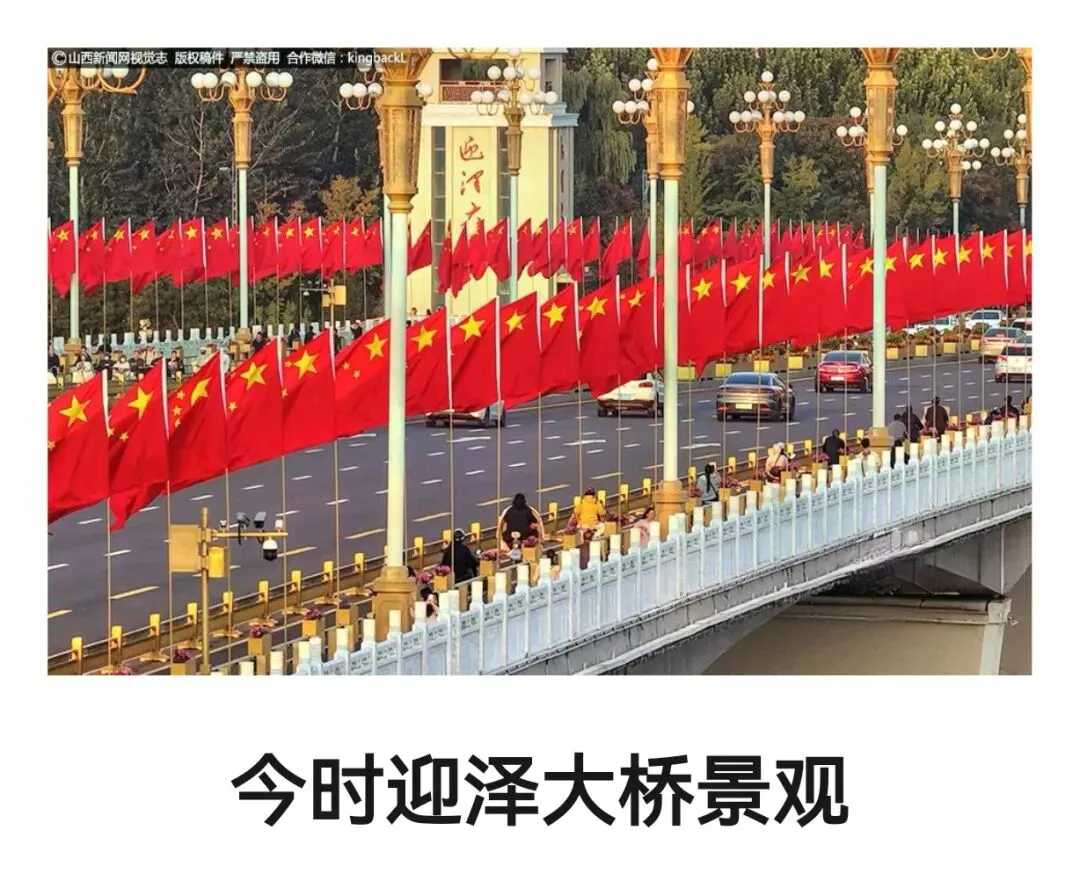 时光流转至2025年,迎泽桥迎来了它的第五次“蜕变”。国庆期间,经过精心改造的迎泽桥以崭新姿态亮相,迅速成为太原的城市焦点。改造后的迎泽桥,在保留历史韵味的同时,注入了更多现代元素与人文关怀:桥体两侧红旗招展,鲜艳的红色在阳光下格外夺目,浓浓的节庆氛围扑面而来,让每一位经过的市民与游客都能感受到节日的喜悦;新增的四座桥头堡是此次改造的点睛之笔,淡黄色与暖白色的石材搭配和谐雅致,桥头堡上镶嵌着苍劲有力的毛体“迎泽大桥”红字,不仅字体气势磅礴,更与太原火车站等具有历史感的城市建筑风格相呼应,形成了统一的城市视觉符号;汉白玉栏杆上精心雕刻着“古晋阳八景”,每一幅雕刻都细腻生动,将太原的历史文化景观浓缩于桥梁之上,行人漫步桥上,仿佛在翻阅一部立体的太原历史画卷;桥上安装的中华灯兼具传统韵味与科技感,白天是古朴典雅的装饰,夜晚则亮起璀璨灯光,灯光透过灯盏的纹路洒下,将桥梁装点得流光溢彩,与汾河两岸的夜景交相辉映,美不胜收。