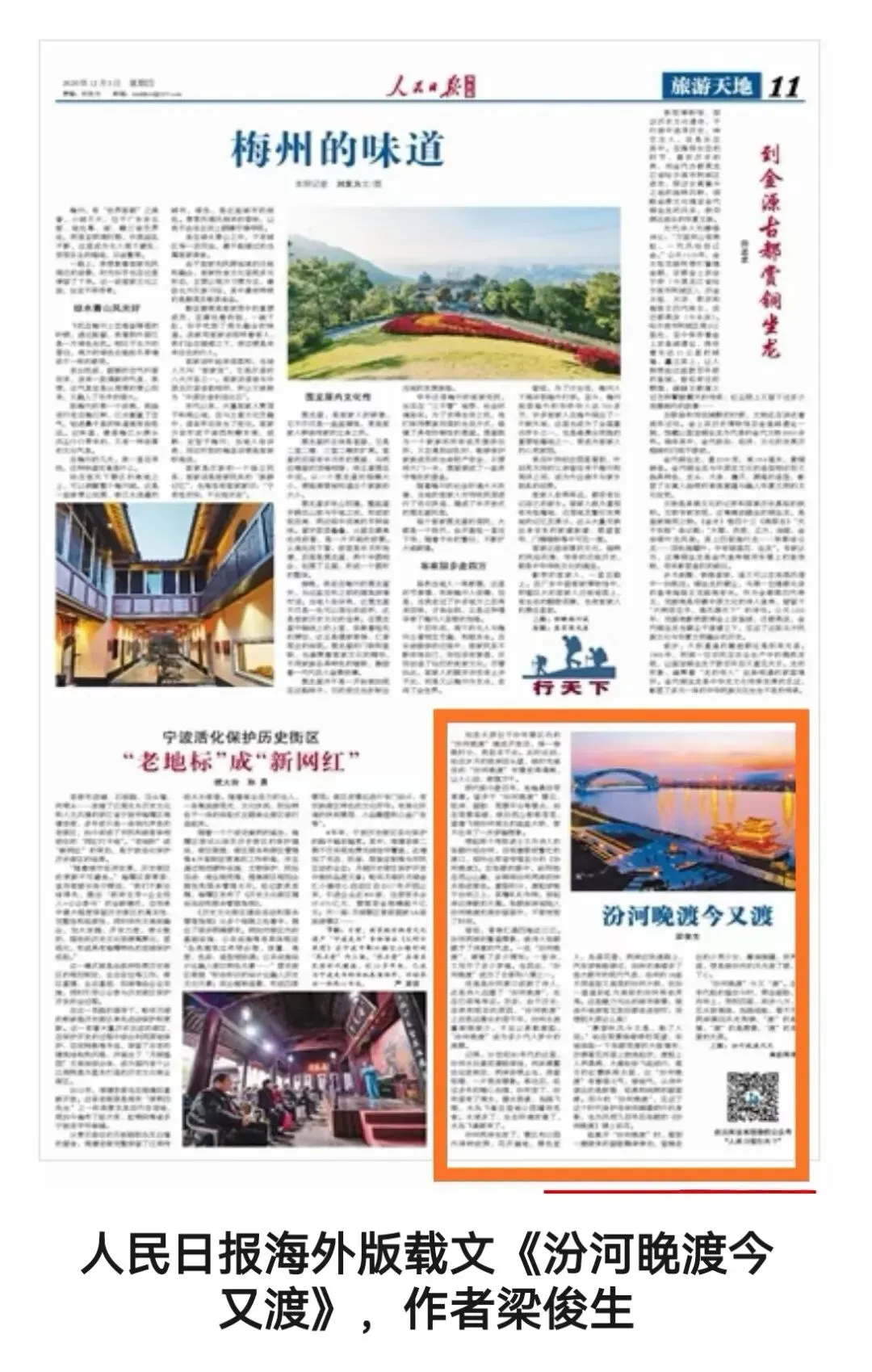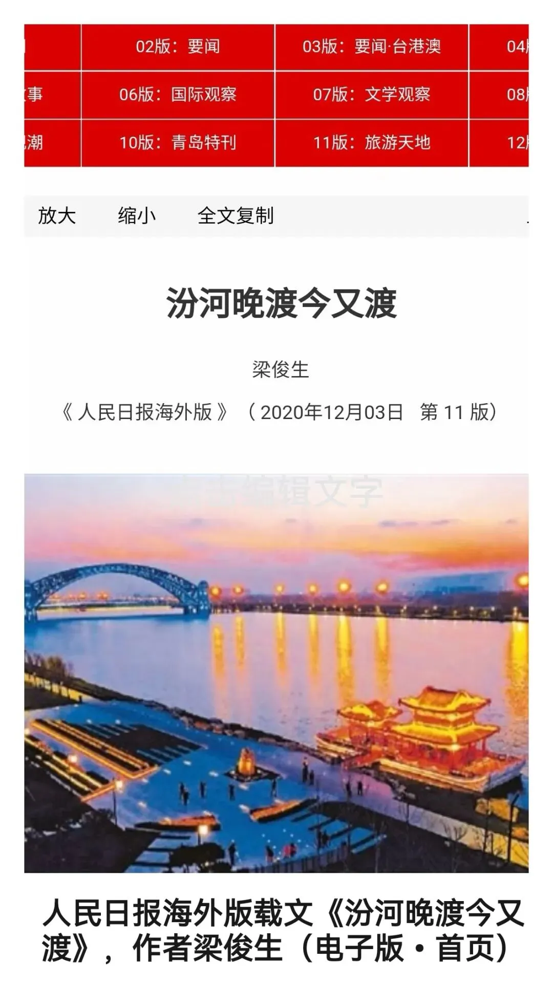 犹记2020年,本人拙作《汾河晚渡今又渡》一文,曾刊发于当年12月3日人民日报海外版第11版“旅游天地”版上,今全文照录如下,愿与诸君共赏析,并将此作为本文结尾部分。全文如下: