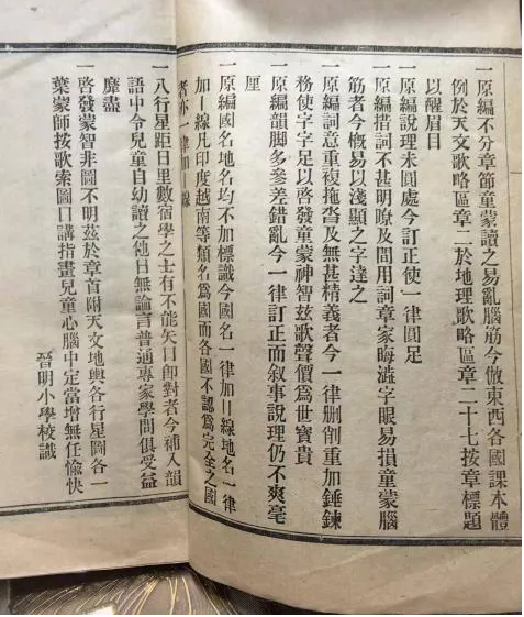 上图为《重订天文地理歌略》凡例,标明晋明小学校